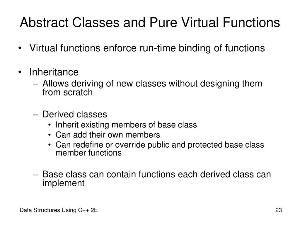 Abstract Classes and Pure Virtual Functions Virtual functions enforce run-time binding of functions Inheritance Allows deriving of new classes without designing them from scratch Derived classes Inherit existing members of base class Can add their own members Can redefine or override public and protected base class member functions Base class can contain functions each derived class can implement Data Structures Using C++ 2E 23