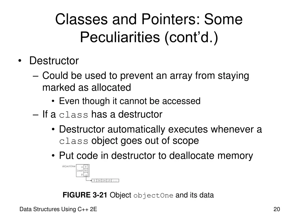 Classes and Pointers: Some Peculiarities (cont d.) Destructor Could be used to prevent an array from staying marked as allocated Even though it cannot be accessed If a class has a destructor Destructor automatically executes whenever a class object goes out of scope Put code in destructor to deallocate memory FIGURE 3-21 Object objectOne and its data Data Structures Using C++ 2E 20