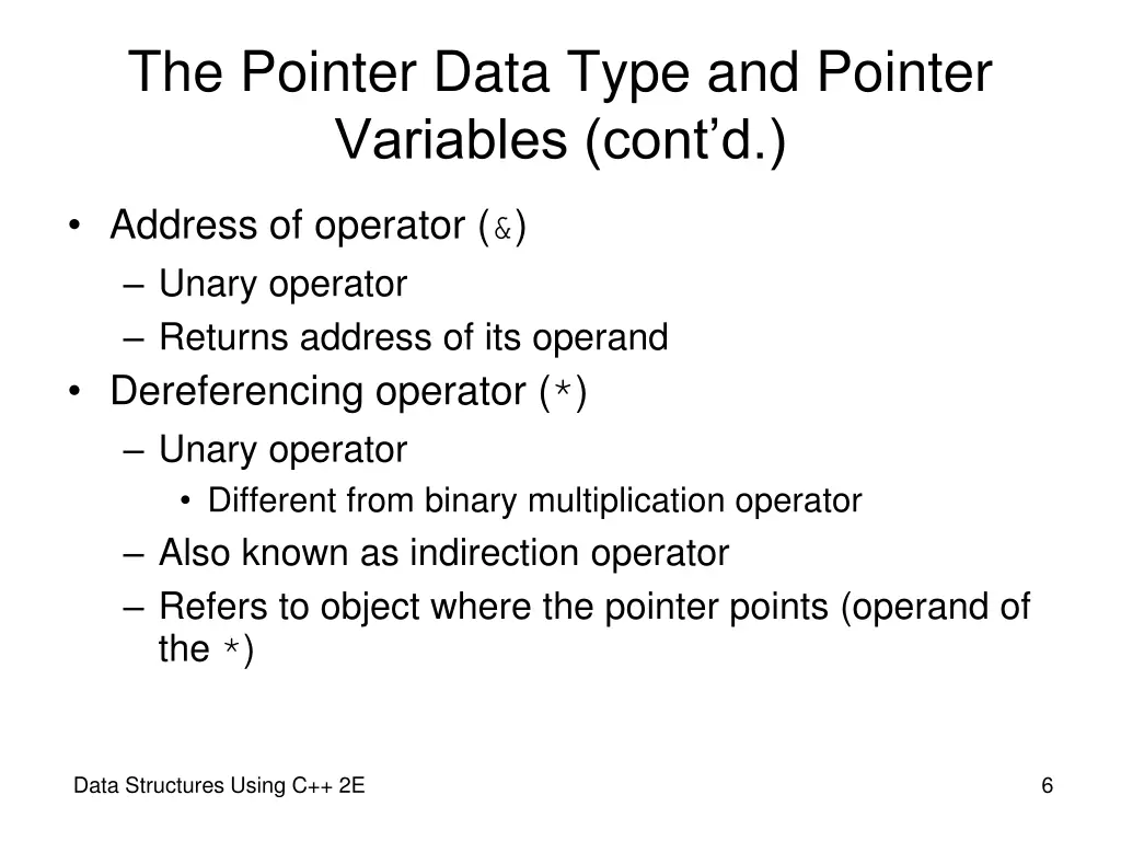 The Pointer Data Type and Pointer Variables (cont d.) Declaring pointer variables Specify data type of value stored in the memory location that pointer variable points to General syntax dataType *identifier; Asterisk symbol (*) Between data type and variable name Can appear anywhere between the two Preference: attach * to variable name Examples: int *p; and char *ch; Data Structures Using C++ 2E 5