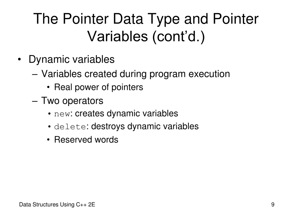 The Pointer Data Type and Pointer Variables (cont d.) Dynamic variables Variables created during program execution Real power of pointers Two operators new: creates dynamic variables delete: destroys dynamic variables Reserved words Data Structures Using C++ 2E 9