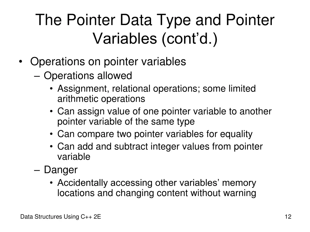 The Pointer Data Type and Pointer Variables (cont d.) Operations on pointer variables Operations allowed Assignment, relational operations; some limited arithmetic operations Can assign value of one pointer variable to another pointer variable of the same type Can compare two pointer variables for equality Can add and subtract integer values from pointer variable Danger Accidentally accessing other variables memory locations and changing content without warning Data Structures Using C++ 2E 12