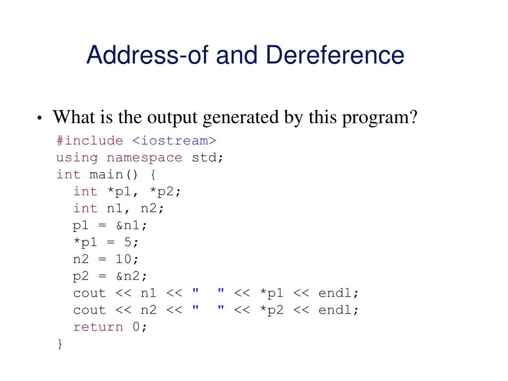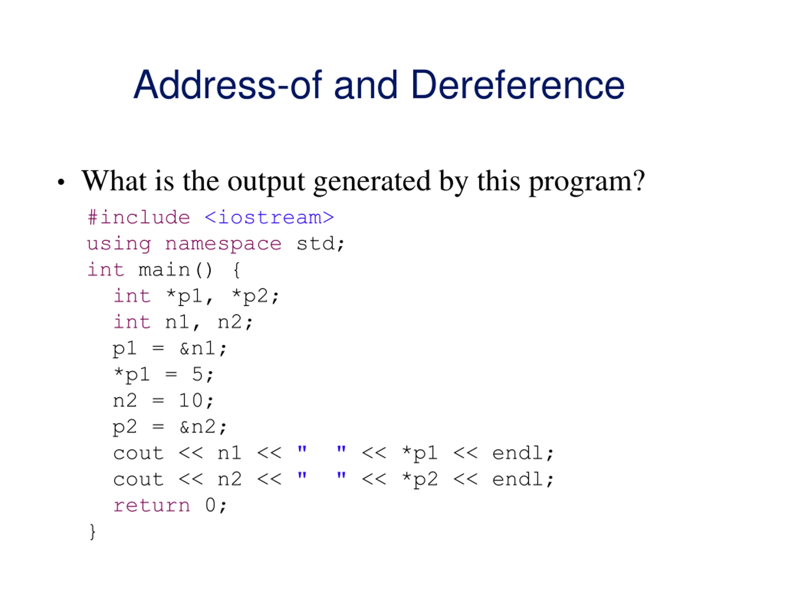 Address-of and Dereference What is the output generated by this program? #include <iostream> using namespace std; int main() { int *p1, *p2; int n1, n2; p1 = &n1; *p1 = 5; n2 = 10; p2 = &n2; cout << n1 << " " << *p1 << endl; cout << n2 << " " << *p2 << endl; return 0; }