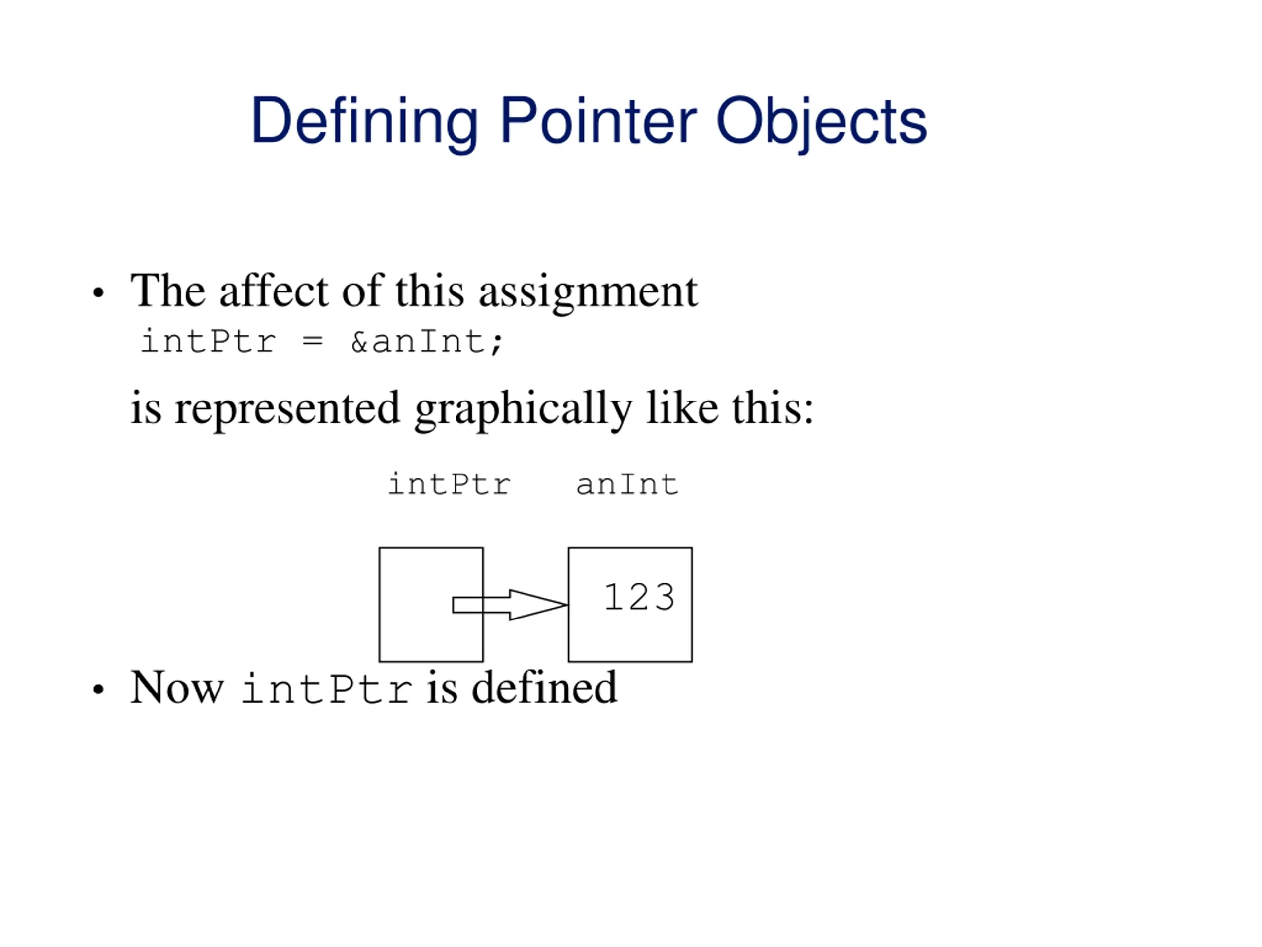 Defining Pointer Objects The affect of this assignment intPtr = &anInt; is represented graphically like this: intPtr anInt 123 Now intPtr is defined