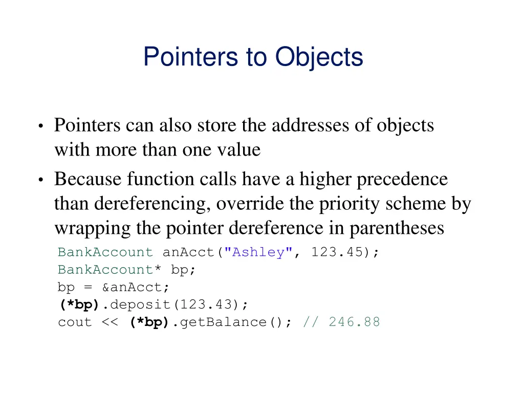 Pointers to Objects Pointers can also store the addresses of objects with more than one value Because function calls have a higher precedence than dereferencing, override the priority scheme by wrapping the pointer dereference in parentheses BankAccount anAcct("Ashley", 123.45); BankAccount* bp; bp = &anAcct; (*bp).deposit(123.43); cout << (*bp).getBalance(); // 246.88