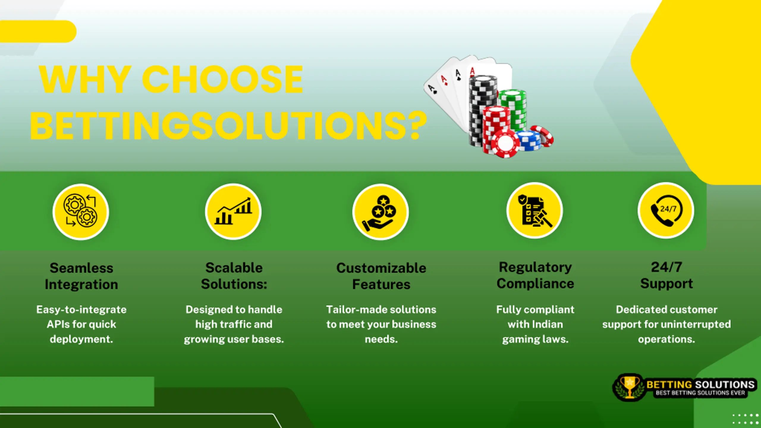 WHY CHOOSE BETTINGSOLUTIONS? Regulatory Compliance 24/7 Support Scalable Solutions: Seamless Integration Customizable Features Easy-to-integrate APIs for quick deployment. Designed to handle high traffic and growing user bases. Tailor-made solutions to meet your business needs. Fully compliant with Indian gaming laws. Dedicated customer support for uninterrupted operations.