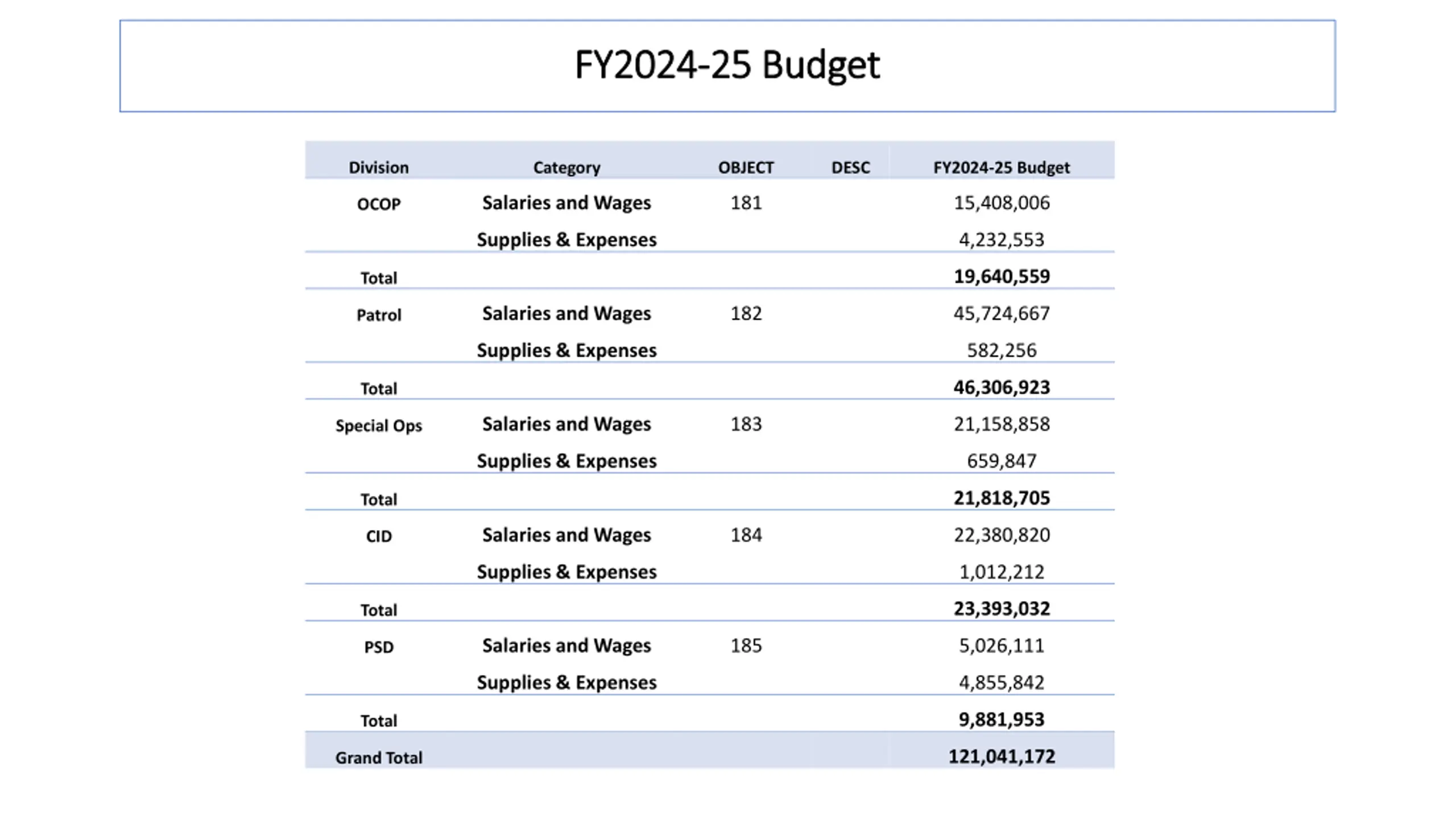 FY2024 FY2024- -25 Budget 25 Budget Division Category OBJECT DESC FY2024-25 Budget Salaries and Wages 181 15,408,006 OCOP Supplies & Expenses 4,232,553 19,640,559 Total Salaries and Wages 182 45,724,667 Patrol Supplies & Expenses 582,256 46,306,923 Total Salaries and Wages 183 21,158,858 Special Ops Supplies & Expenses 659,847 21,818,705 Total Salaries and Wages 184 22,380,820 CID Supplies & Expenses 1,012,212 23,393,032 Total Salaries and Wages 185 5,026,111 PSD Supplies & Expenses 4,855,842 9,881,953 Total 121,041,172 Grand Total
