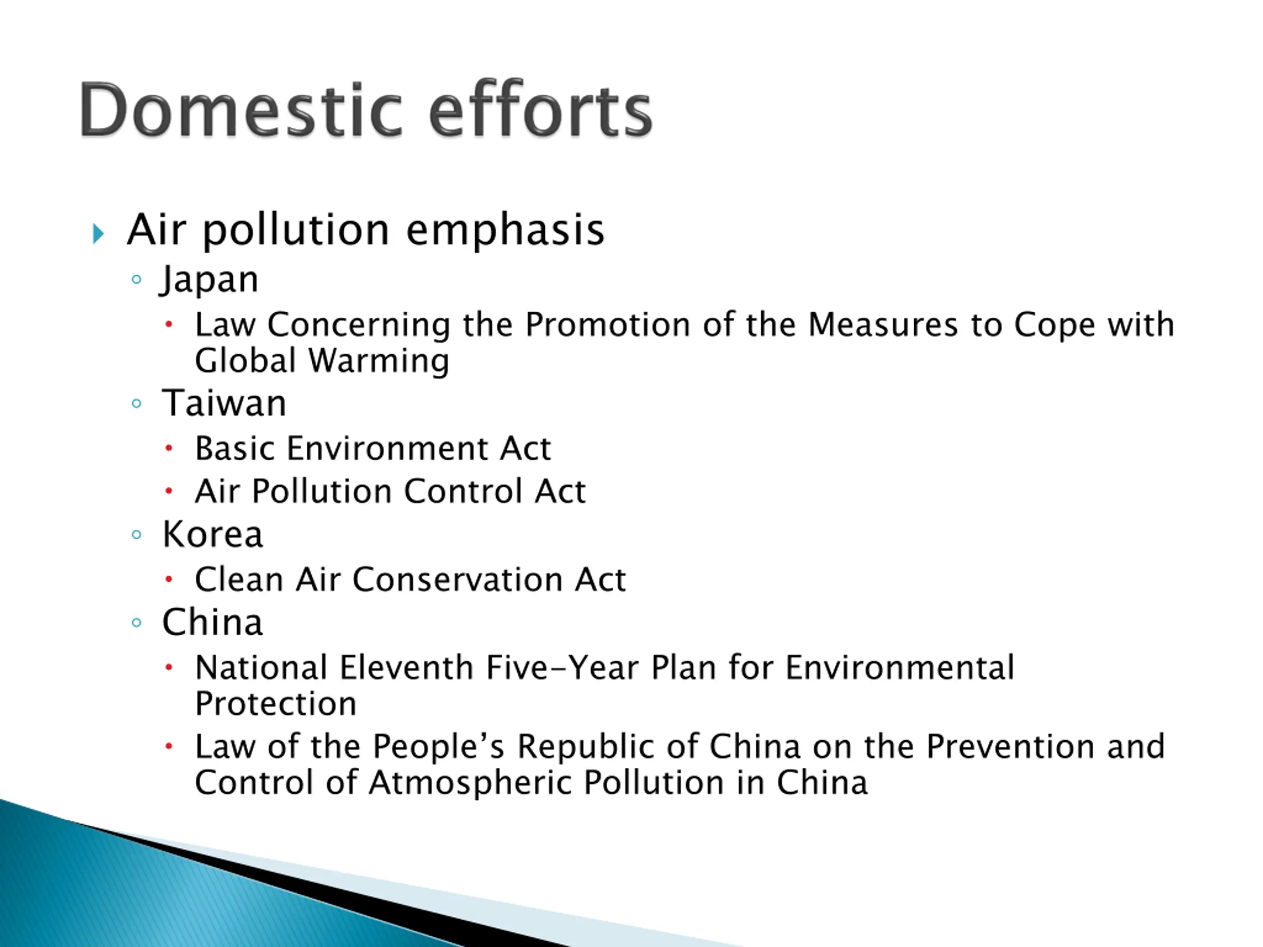 Air pollution emphasis Japan Law Concerning the Promotion of the Measures to Cope with Global Warming Taiwan Basic Environment Act Air Pollution Control Act Korea Clean Air Conservation Act China National Eleventh Five-Year Plan for Environmental Protection Law of the People s Republic of China on the Prevention and Control of Atmospheric Pollution in China