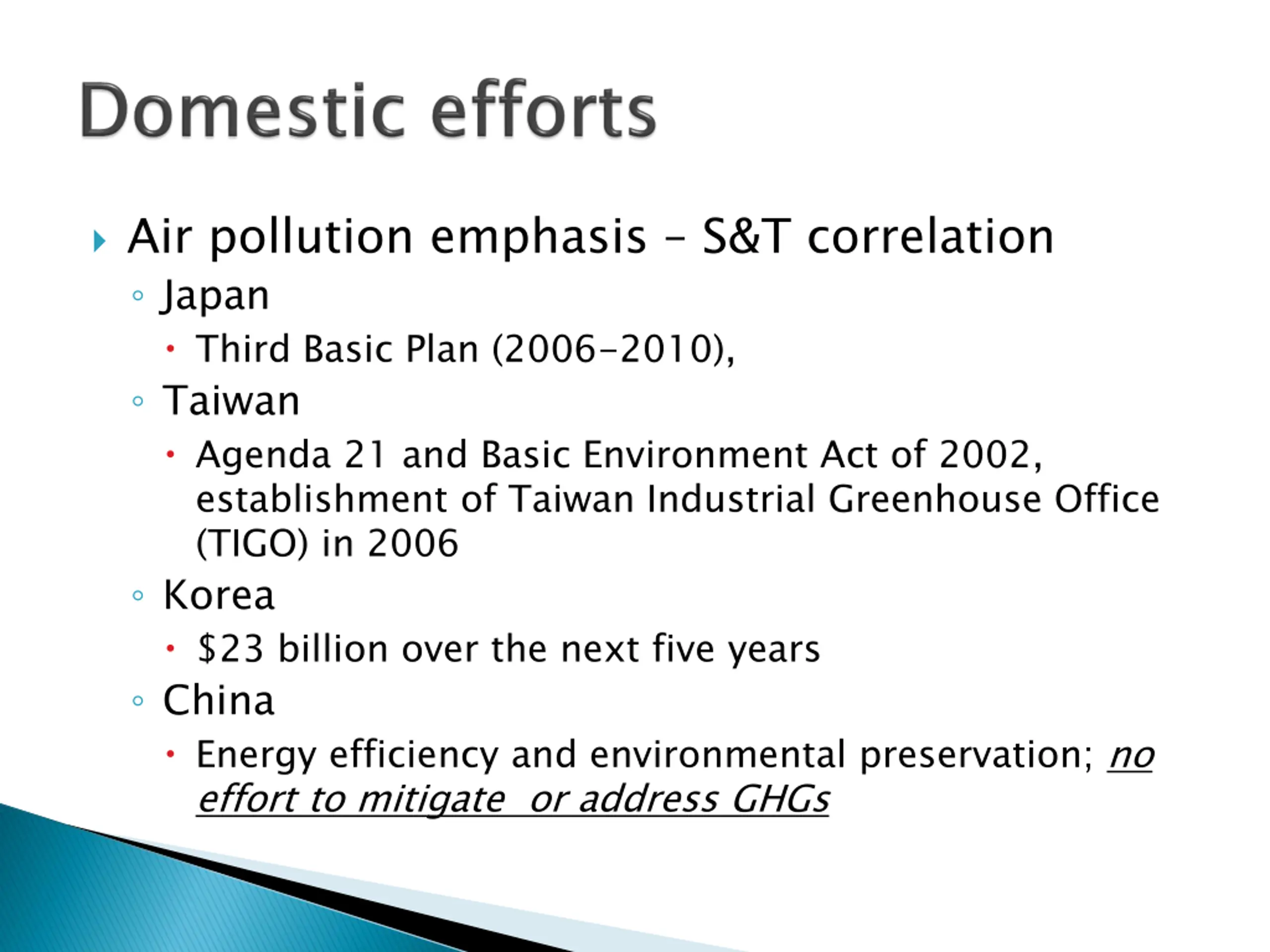 Air pollution emphasis S&T correlation Japan Third Basic Plan (2006-2010), Taiwan Agenda 21 and Basic Environment Act of 2002, establishment of Taiwan Industrial Greenhouse Office (TIGO) in 2006 Korea $23 billion over the next five years China Energy efficiency and environmental preservation; no effort to mitigate or address GHGs