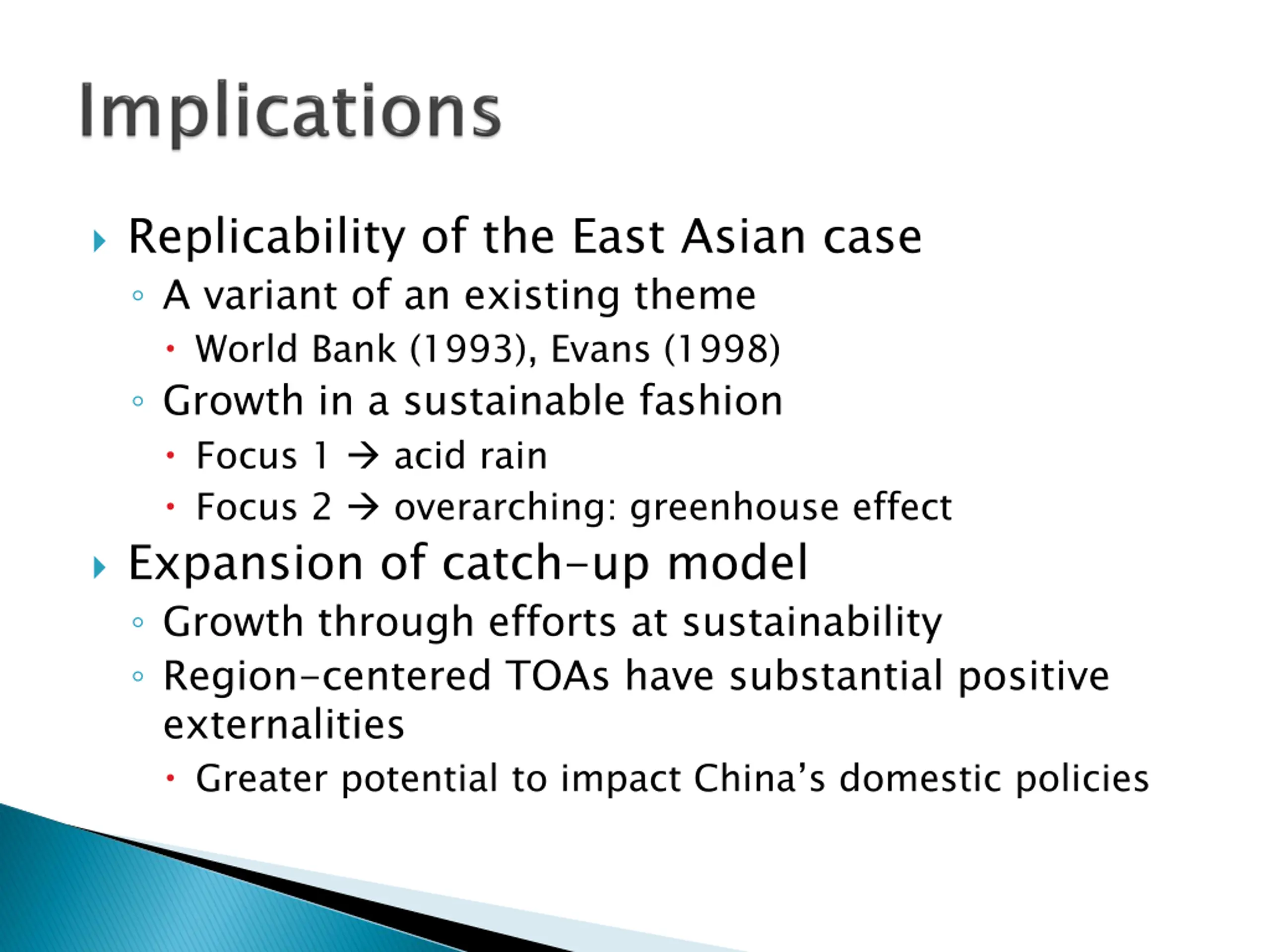 Replicability of the East Asian case A variant of an existing theme World Bank (1993), Evans (1998) Growth in a sustainable fashion Focus 1 acid rain Focus 2 overarching: greenhouse effect Expansion of catch-up model Growth through efforts at sustainability Region-centered TOAs have substantial positive externalities Greater potential to impact China s domestic policies