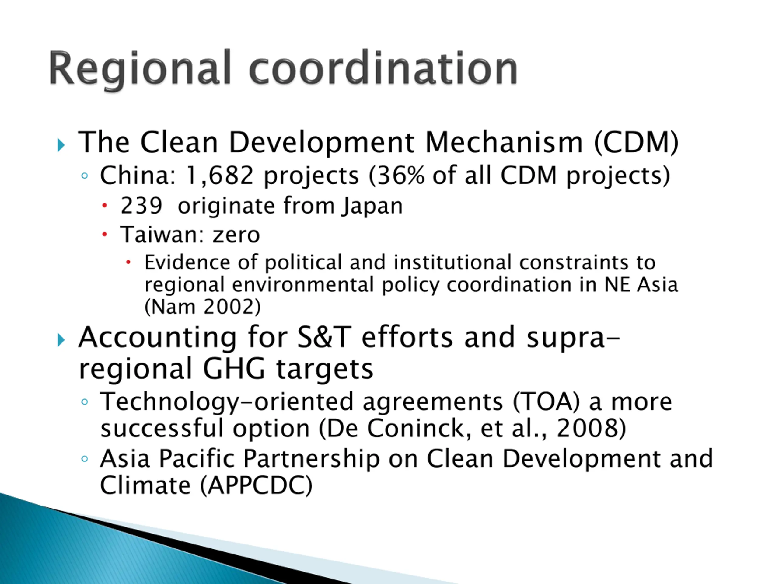 The Clean Development Mechanism (CDM) China: 1,682 projects (36% of all CDM projects) 239 originate from Japan Taiwan: zero Evidence of political and institutional constraints to regional environmental policy coordination in NE Asia (Nam 2002) Accounting for S&T efforts and supra- regional GHG targets Technology-oriented agreements (TOA) a more successful option (De Coninck, et al., 2008) Asia Pacific Partnership on Clean Development and Climate (APPCDC)
