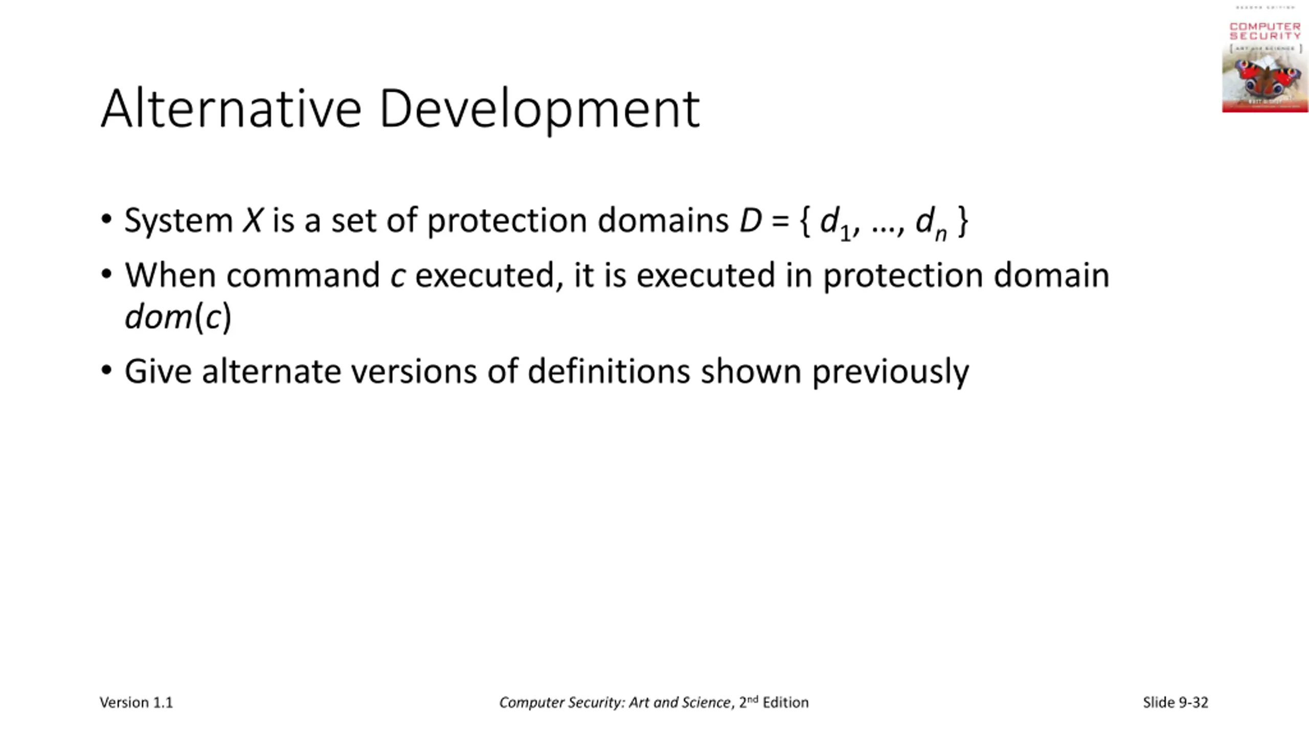 Alternative Development System X is a set of protection domains D = { d1, , dn } When command c executed, it is executed in protection domain dom(c) Give alternate versions of definitions shown previously Computer Security: Art and Science, 2nd Edition Version 1.1 Slide 9-32