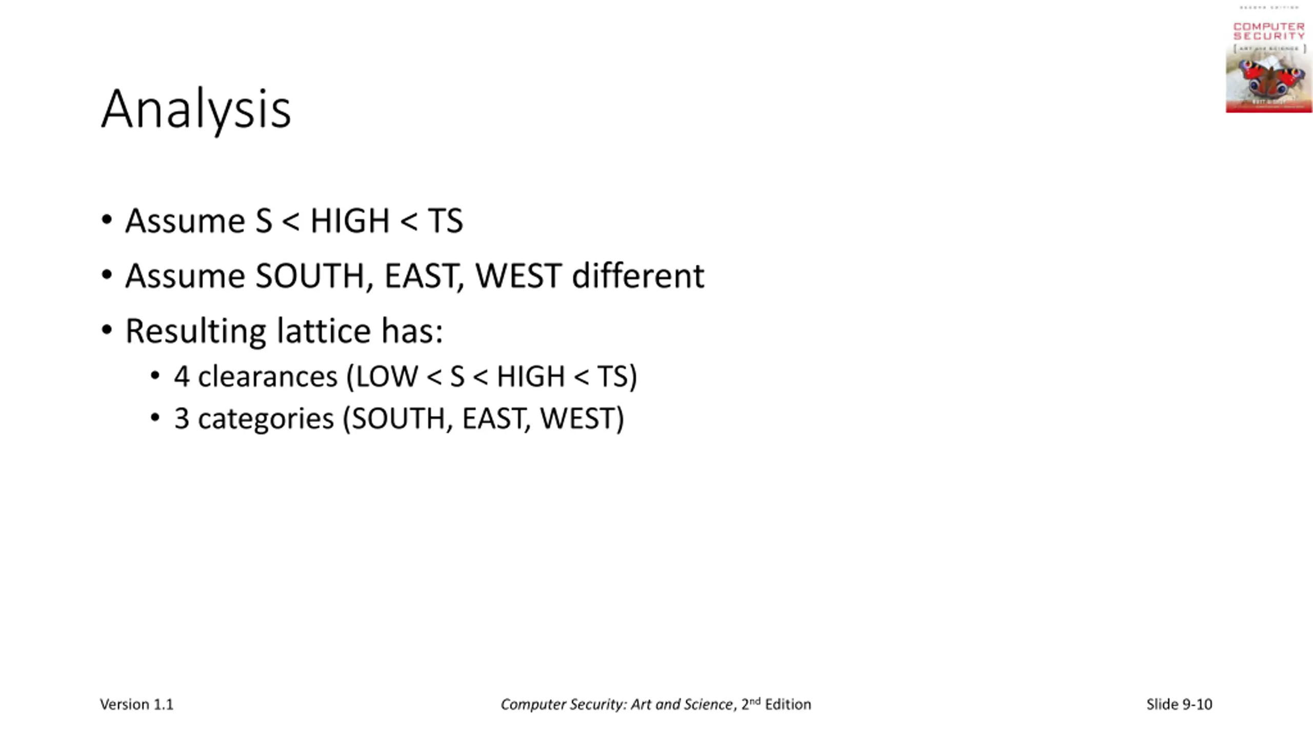 Analysis Assume S < HIGH < TS Assume SOUTH, EAST, WEST different Resulting lattice has: 4 clearances (LOW < S < HIGH < TS) 3 categories (SOUTH, EAST, WEST) Computer Security: Art and Science, 2nd Edition Version 1.1 Slide 9-10