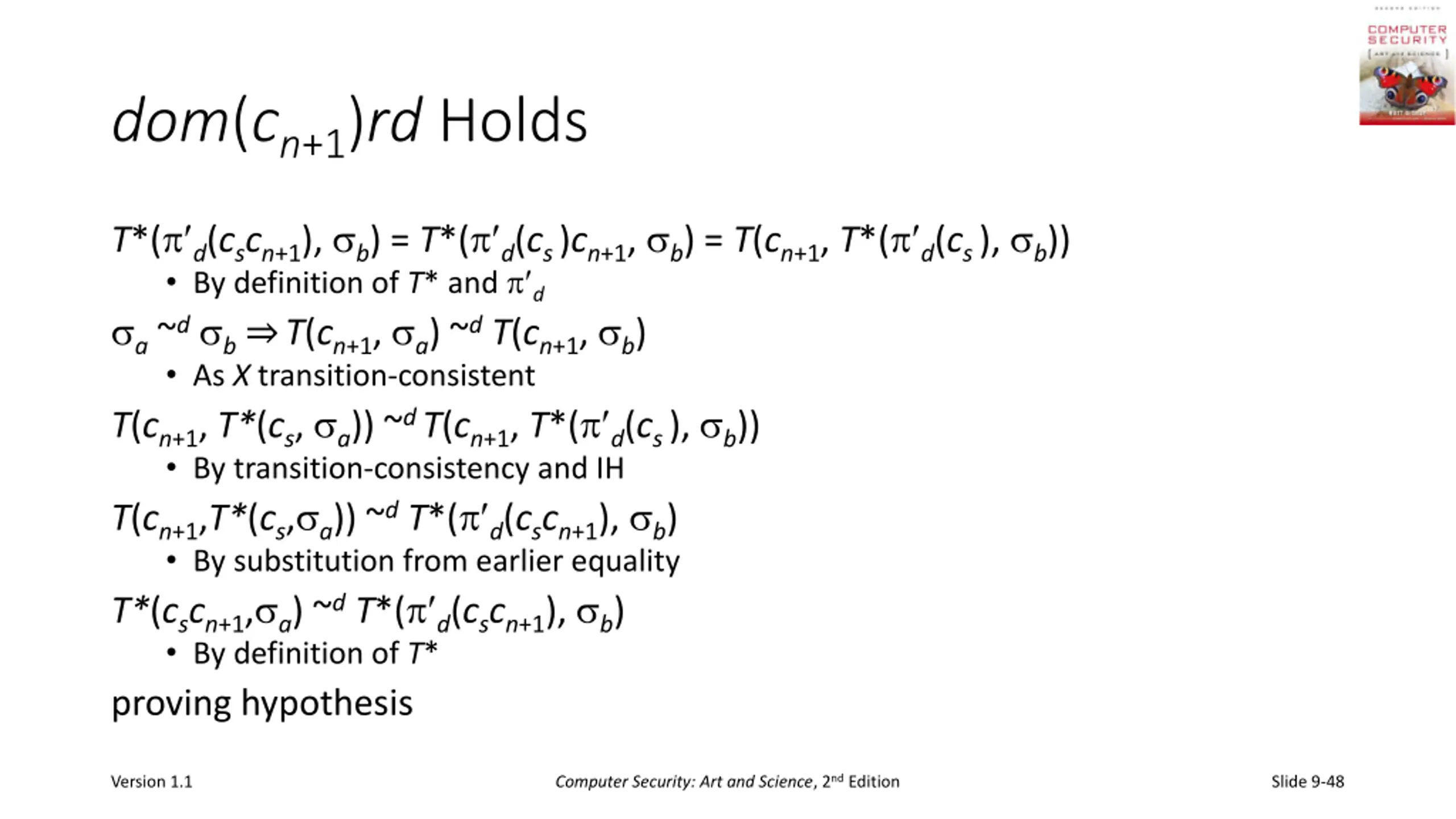 dom(cn+1)rd Holds T*( d(cscn+1), b) = T*( d(cs )cn+1, b) = T(cn+1, T*( d(cs ), b)) By definition of T* and d a ~d b T(cn+1, a) ~dT(cn+1, b) As X transition-consistent T(cn+1, T*(cs, a)) ~d T(cn+1, T*( d(cs ), b)) By transition-consistency and IH T(cn+1,T*(cs, a)) ~d T*( d(cscn+1), b) By substitution from earlier equality T*(cscn+1, a) ~d T*( d(cscn+1), b) By definition of T* proving hypothesis Computer Security: Art and Science, 2nd Edition Version 1.1 Slide 9-48