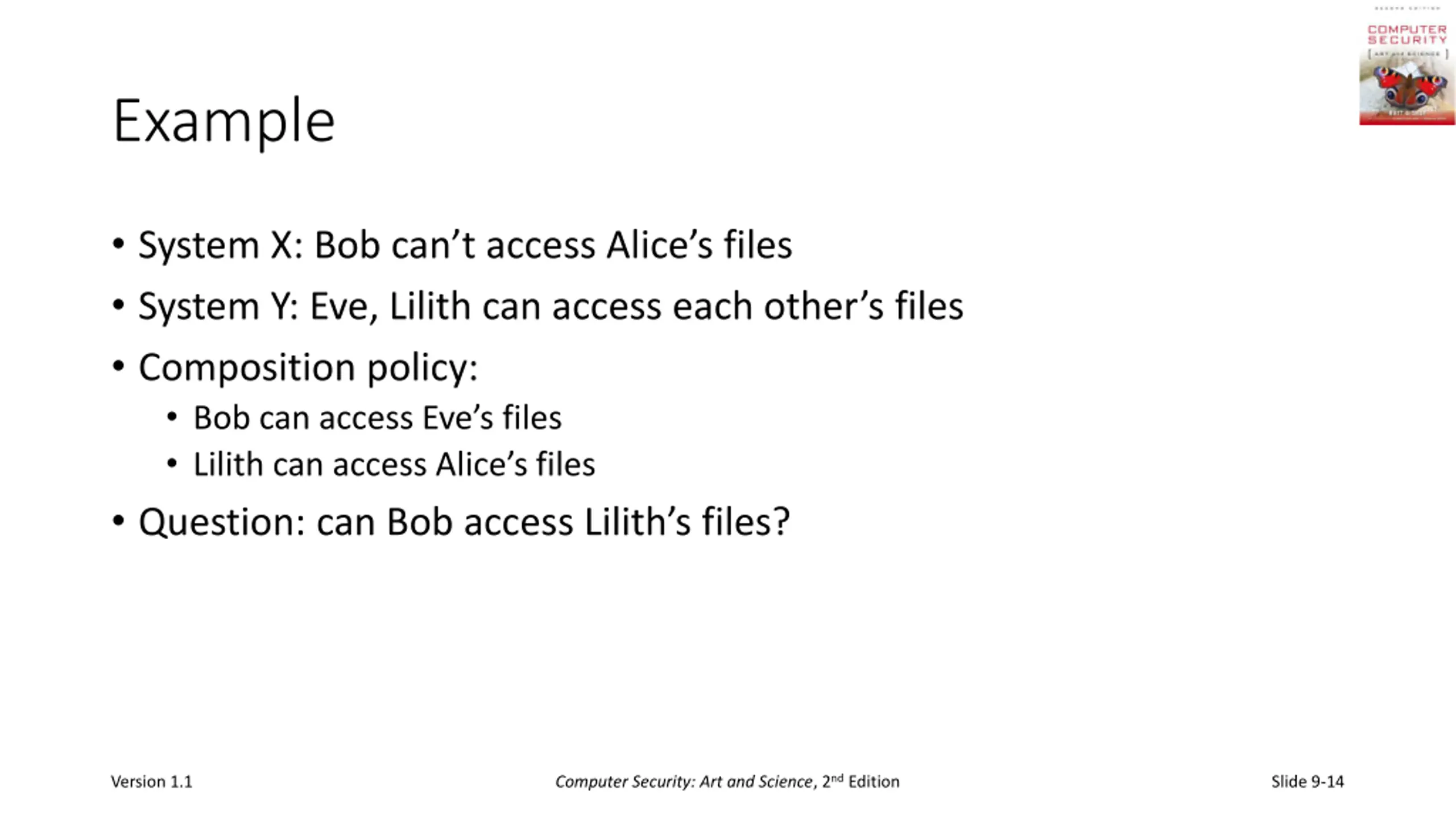Example System X: Bob can t access Alice s files System Y: Eve, Lilith can access each other s files Composition policy: Bob can access Eve s files Lilith can access Alice s files Question: can Bob access Lilith s files? Computer Security: Art and Science, 2nd Edition Version 1.1 Slide 9-14
