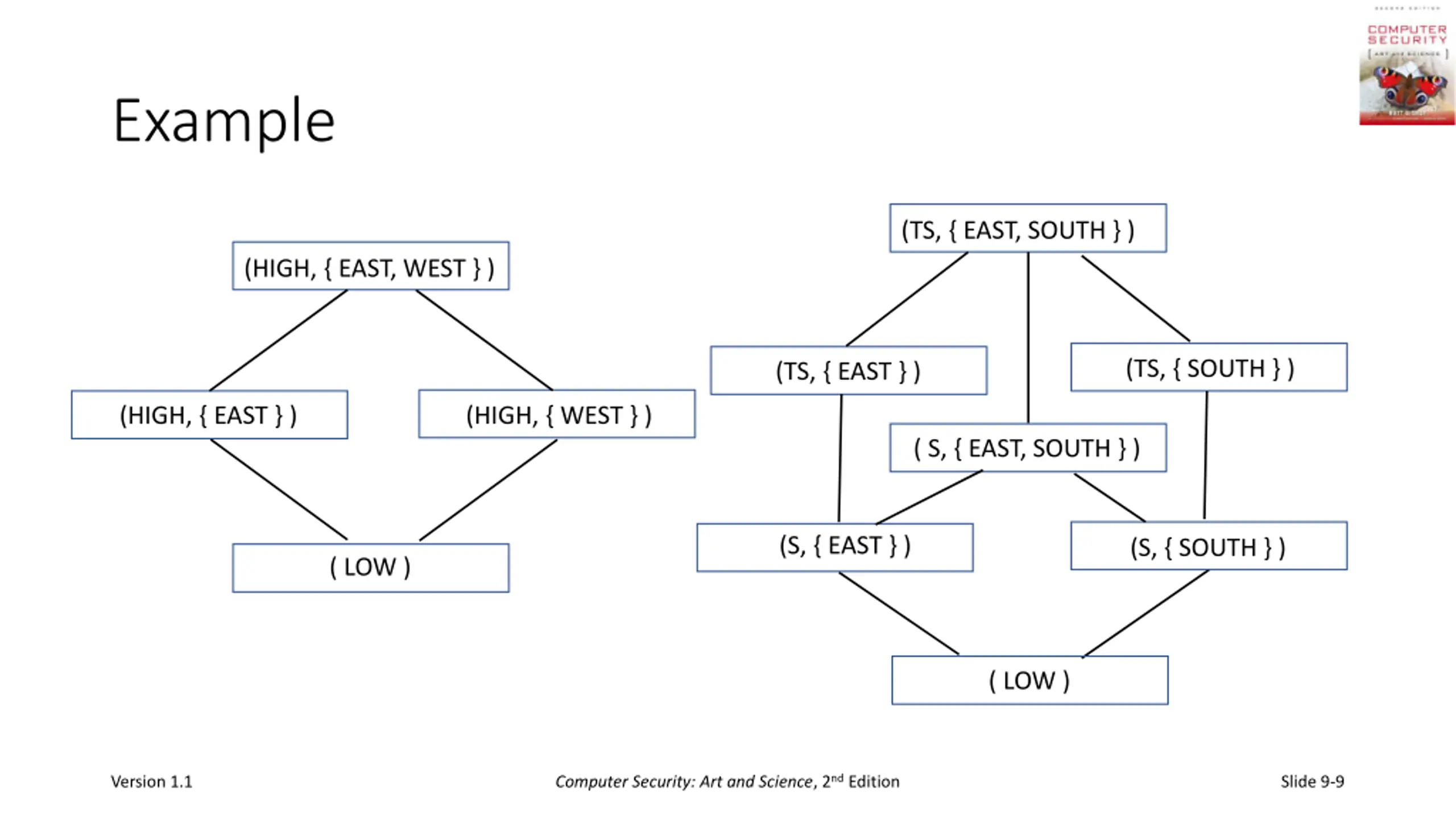 Example (TS, { EAST, SOUTH } ) (HIGH, { EAST, WEST } ) (TS, { SOUTH } ) (TS, { EAST } ) (HIGH, { EAST } ) (HIGH, { WEST } ) ( S, { EAST, SOUTH } ) (S, { EAST } ) (S, { SOUTH } ) ( LOW ) ( LOW ) Computer Security: Art and Science, 2nd Edition Version 1.1 Slide 9-9
