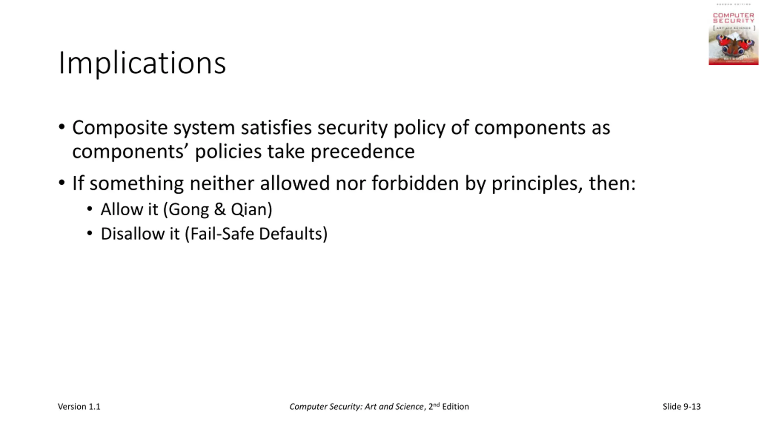 Implications Composite system satisfies security policy of components as components policies take precedence If something neither allowed nor forbidden by principles, then: Allow it (Gong & Qian) Disallow it (Fail-Safe Defaults) Computer Security: Art and Science, 2nd Edition Version 1.1 Slide 9-13