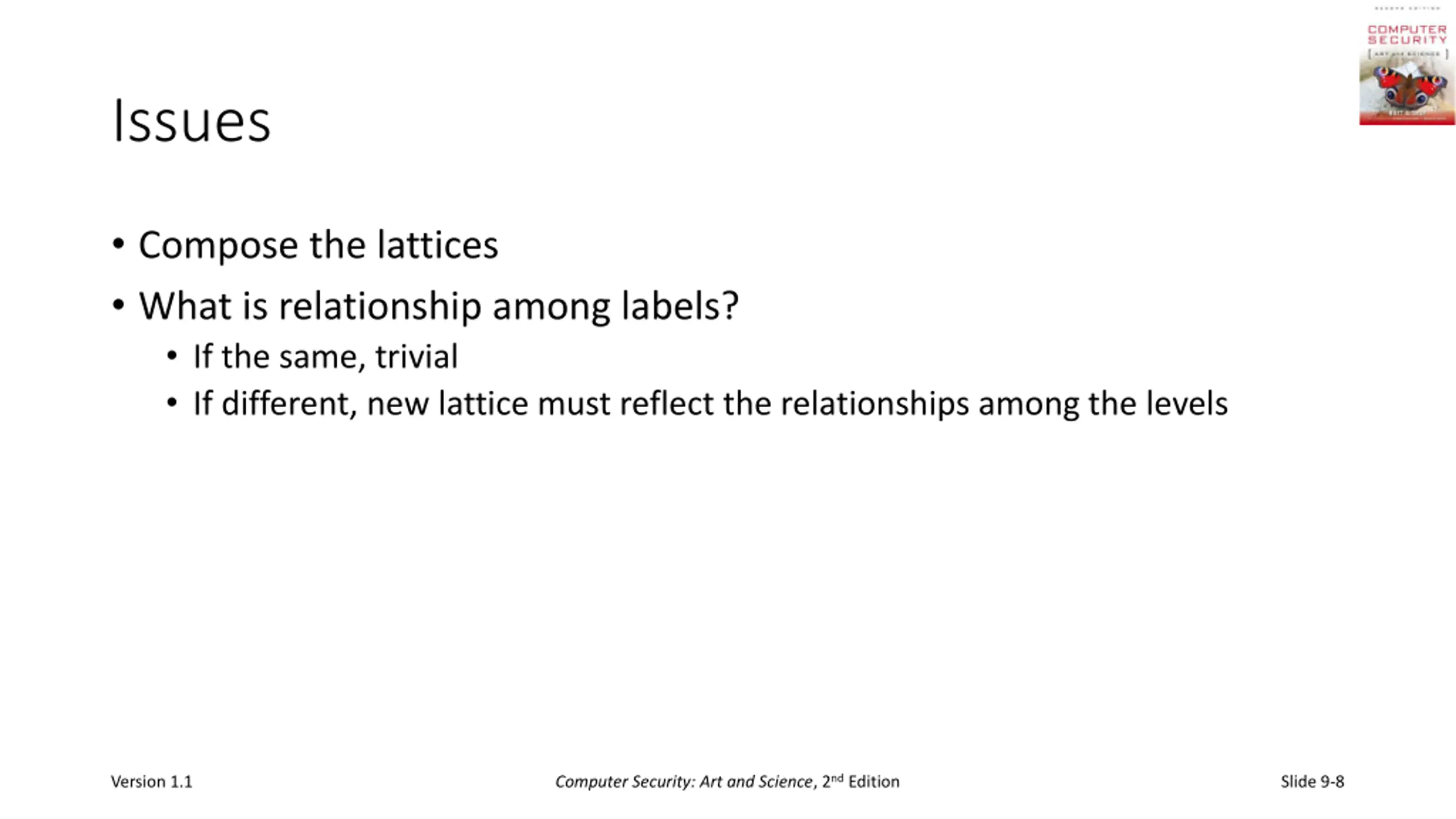 Issues Compose the lattices What is relationship among labels? If the same, trivial If different, new lattice must reflect the relationships among the levels Computer Security: Art and Science, 2nd Edition Version 1.1 Slide 9-8