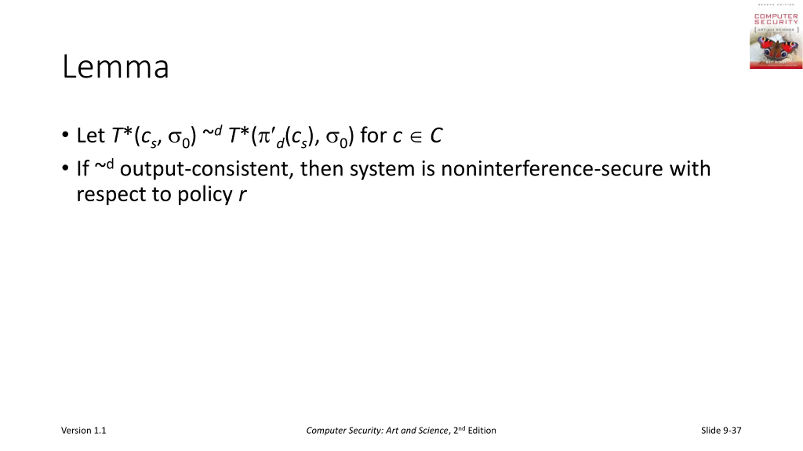 Lemma Let T*(cs, 0) ~dT*( d(cs), 0) for c C If ~d output-consistent, then system is noninterference-secure with respect to policy r Computer Security: Art and Science, 2nd Edition Version 1.1 Slide 9-37