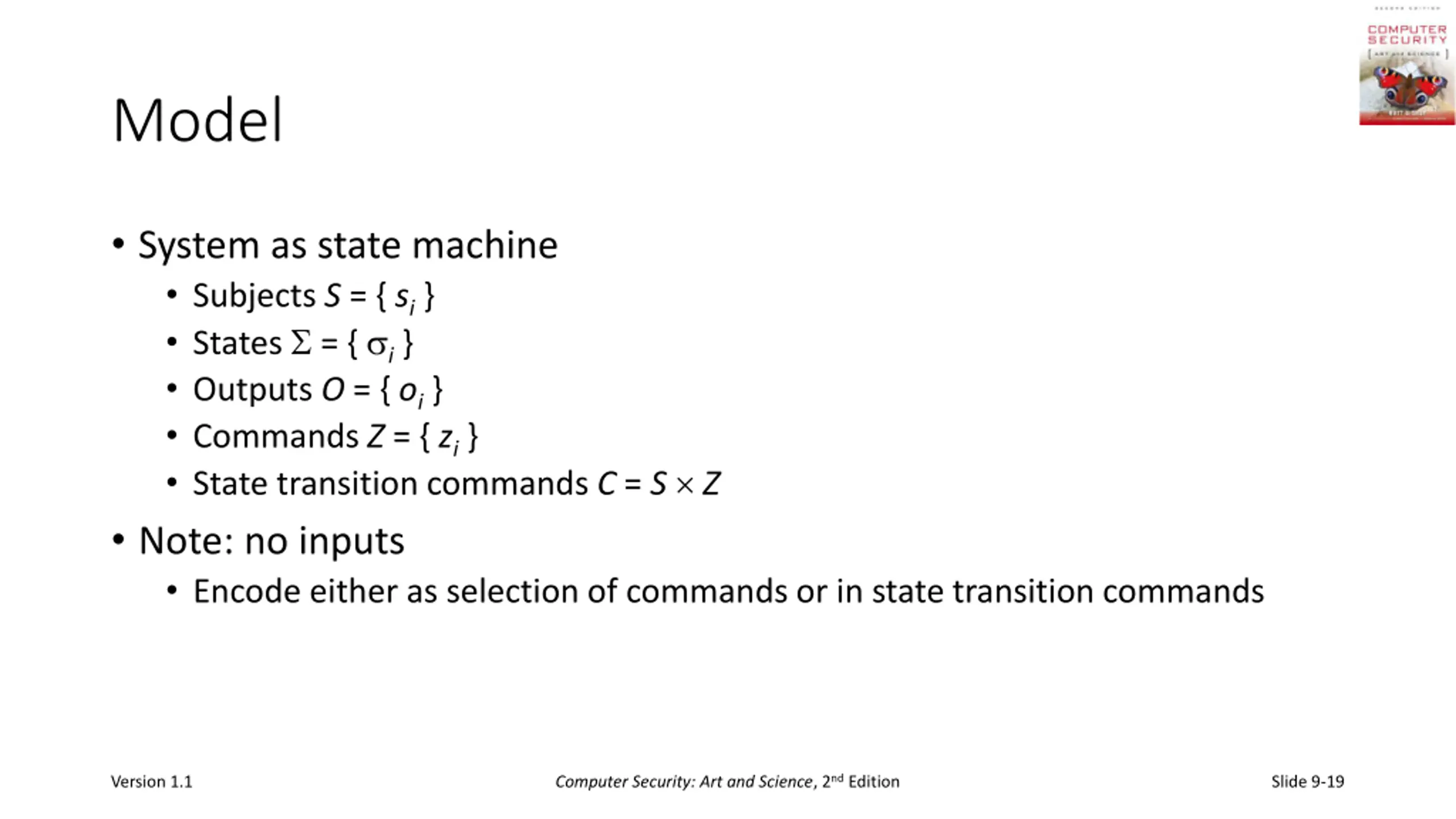 Model System as state machine Subjects S = { si } States = { i } Outputs O = { oi } Commands Z = { zi } State transition commands C = S Z Note: no inputs Encode either as selection of commands or in state transition commands Computer Security: Art and Science, 2nd Edition Version 1.1 Slide 9-19