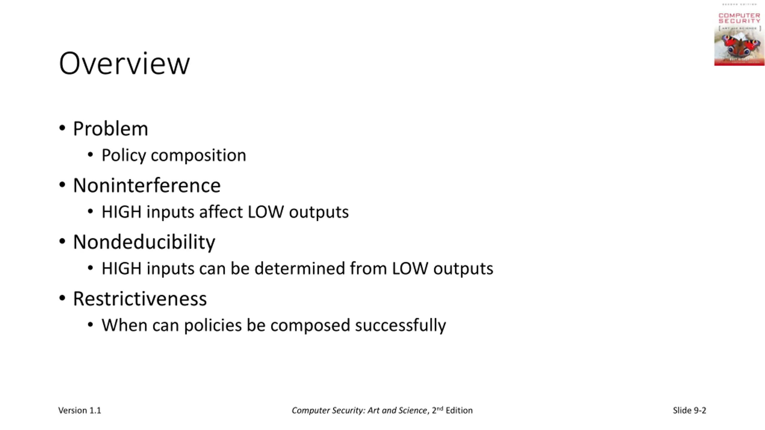 Overview Problem Policy composition Noninterference HIGH inputs affect LOW outputs Nondeducibility HIGH inputs can be determined from LOW outputs Restrictiveness When can policies be composed successfully Computer Security: Art and Science, 2nd Edition Version 1.1 Slide 9-2
