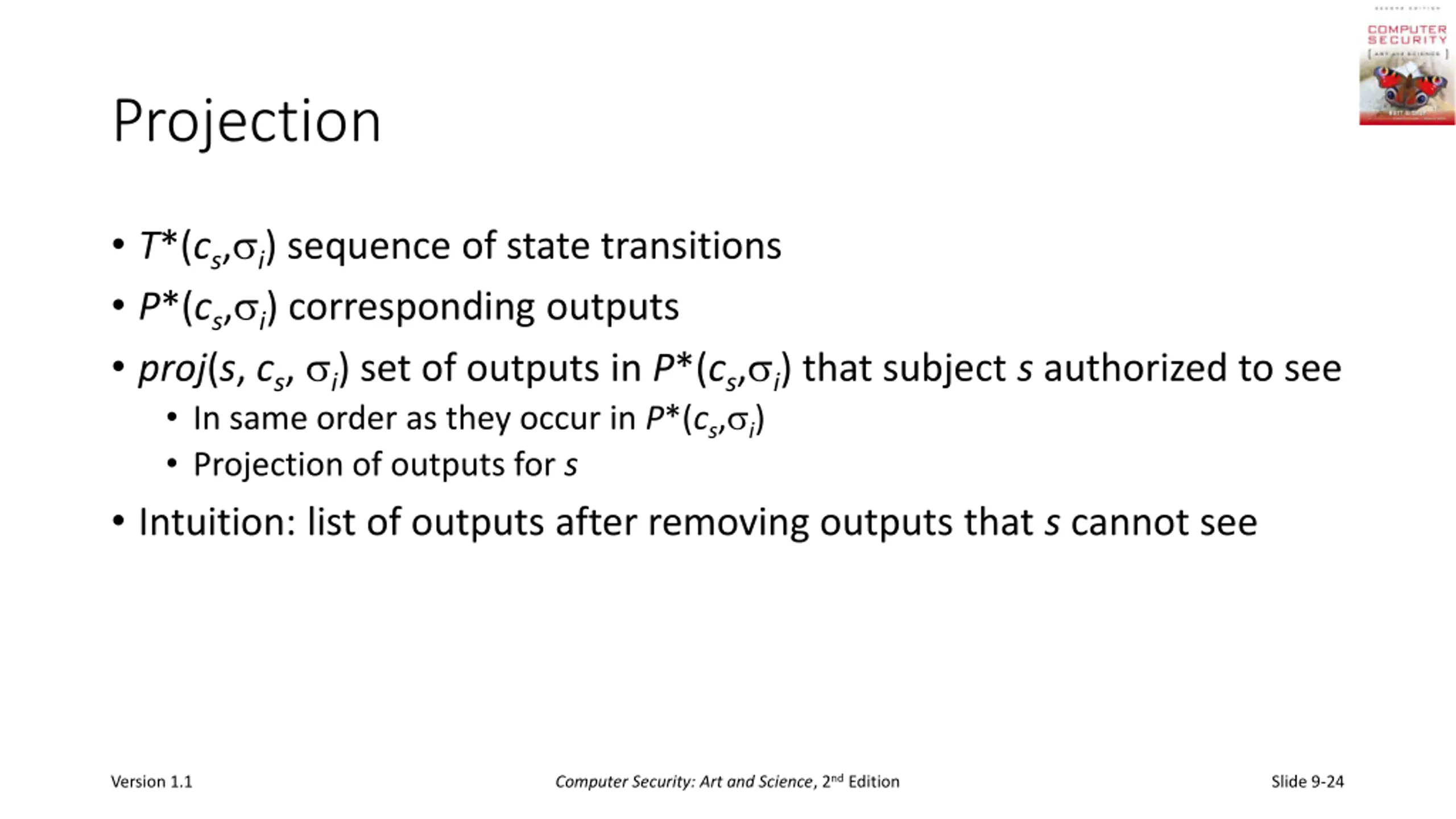 Projection T*(cs, i) sequence of state transitions P*(cs, i) corresponding outputs proj(s, cs, i) set of outputs in P*(cs, i) that subject s authorized to see In same order as they occur in P*(cs, i) Projection of outputs for s Intuition: list of outputs after removing outputs that s cannot see Computer Security: Art and Science, 2nd Edition Version 1.1 Slide 9-24