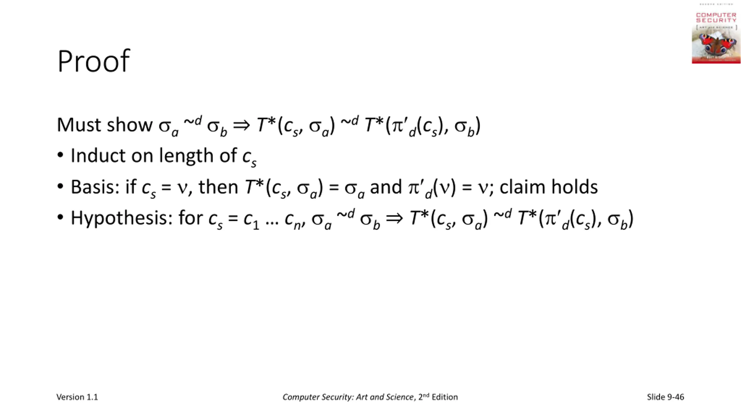 Proof Must show a ~d b T*(cs, a) ~dT*( d(cs), b) Induct on length of cs Basis: if cs = , then T*(cs, a) = a and d( ) = ; claim holds Hypothesis: for cs = c1 cn, a ~d b T*(cs, a) ~dT*( d(cs), b) Computer Security: Art and Science, 2nd Edition Version 1.1 Slide 9-46
