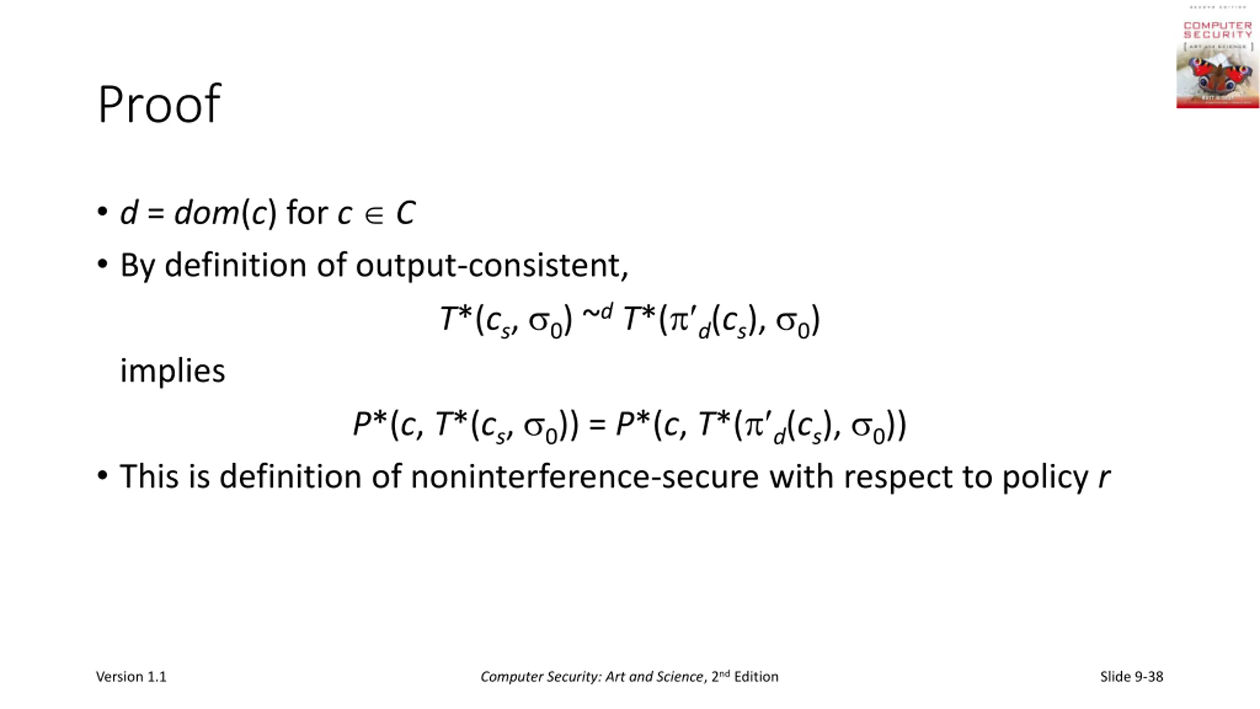 Proof d = dom(c) for c C By definition of output-consistent, T*(cs, 0) ~dT*( d(cs), 0) implies P*(c, T*(cs, 0)) = P*(c, T*( d(cs), 0)) This is definition of noninterference-secure with respect to policy r Computer Security: Art and Science, 2nd Edition Version 1.1 Slide 9-38