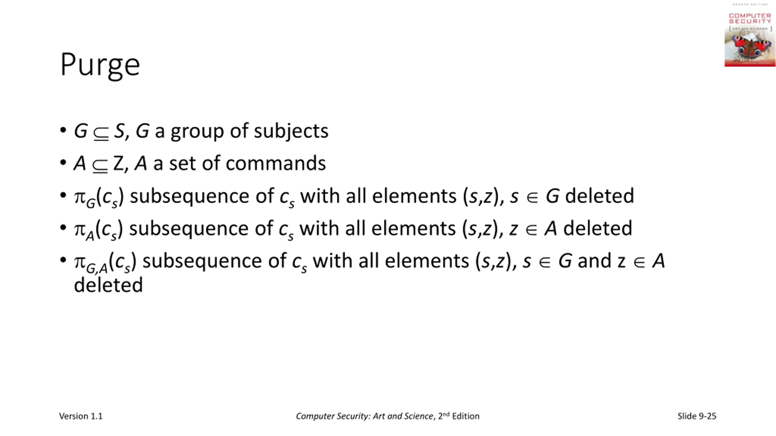 Purge G S, G a group of subjects A Z, A a set of commands G(cs) subsequence of cs with all elements (s,z), s G deleted A(cs) subsequence of cs with all elements (s,z), z A deleted G,A(cs) subsequence of cs with all elements (s,z), s G and z A deleted Computer Security: Art and Science, 2nd Edition Version 1.1 Slide 9-25