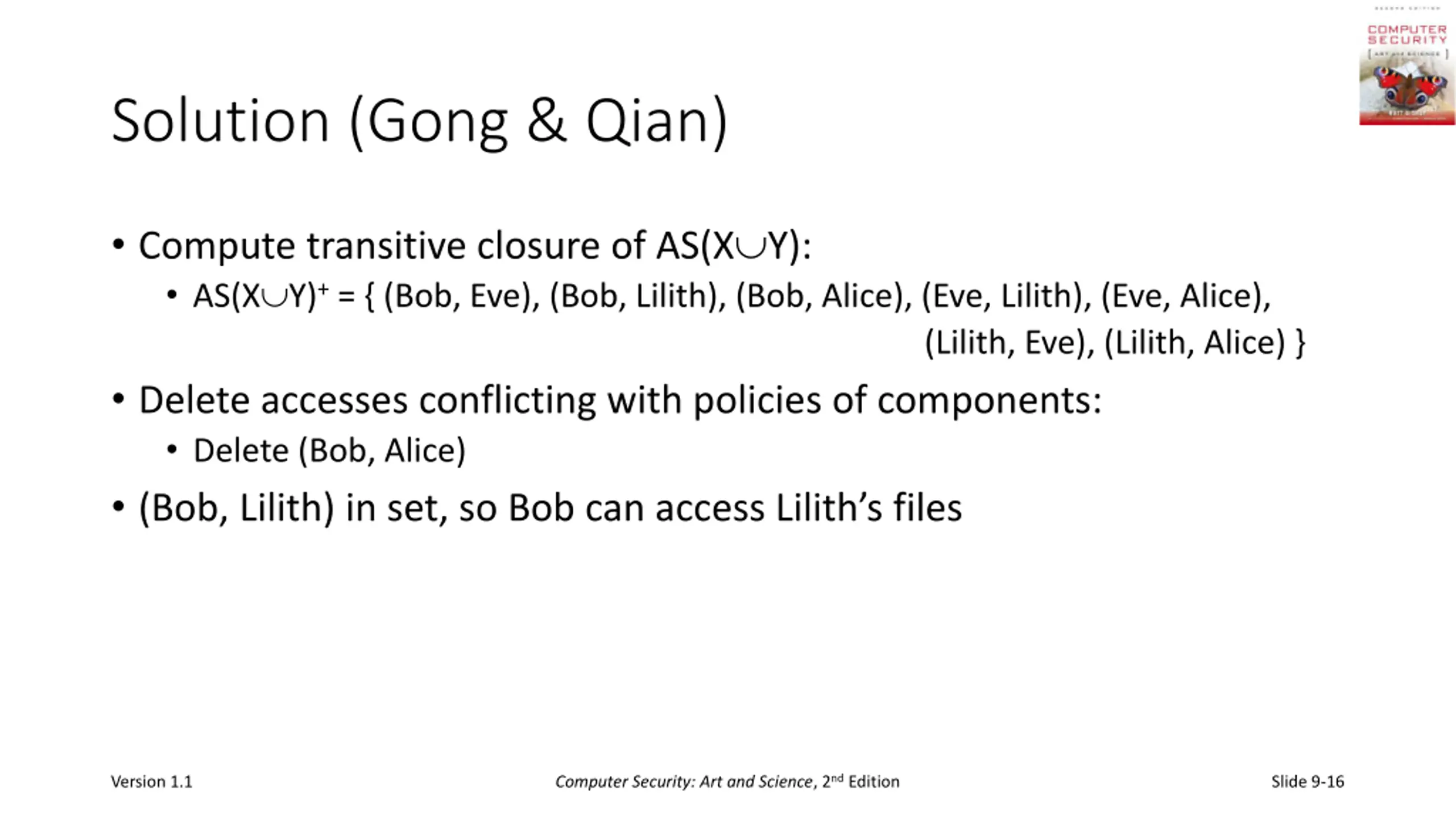 Solution (Gong & Qian) Notation: (a, b): a can read b s files AS(x): access set of system x Set-up: AS(X) = AS(Y) = { (Eve, Lilith), (Lilith, Eve) } AS(X Y) = { (Bob, Eve), (Lilith, Alice), (Eve, Lilith), (Lilith, Eve) } Computer Security: Art and Science, 2nd Edition Version 1.1 Slide 9-15