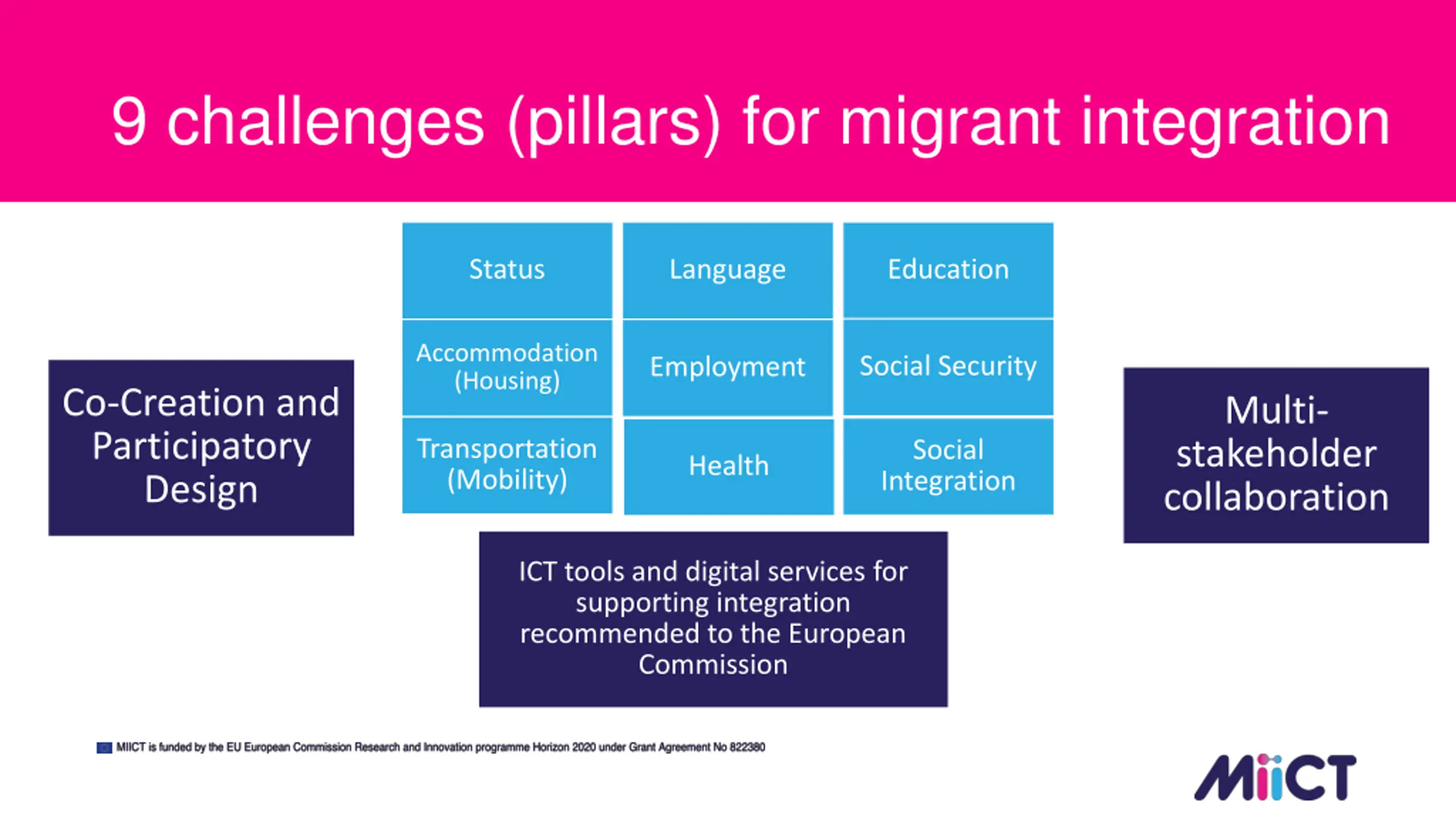 9 challenges (pillars) for migrant integration Status Language Education Accommodation (Housing) Social Security Employment Co-Creation and Participatory Design Multi- stakeholder collaboration Transportation (Mobility) Social Integration Health ICT tools and digital services for supporting integration recommended to the European Commission