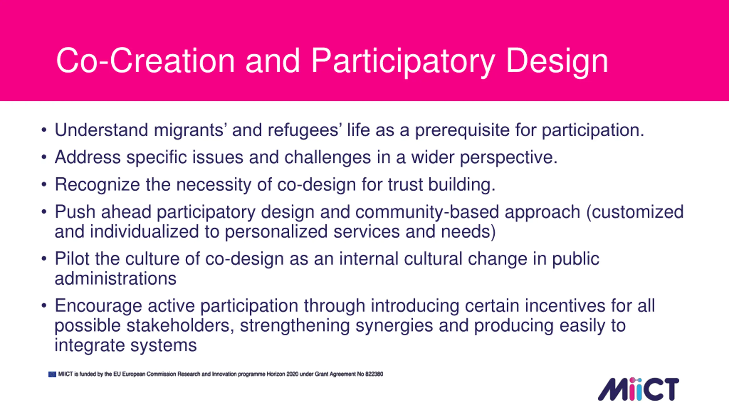 Co-Creation and Participatory Design Understand migrants and refugees life as a prerequisite for participation. Address specific issues and challenges in a wider perspective. Recognize the necessity of co-design for trust building. Push ahead participatory design and community-based approach (customized and individualized to personalized services and needs) Pilot the culture of co-design as an internal cultural change in public administrations Encourage active participation through introducing certain incentives for all possible stakeholders, strengthening synergies and producing easily to integrate systems