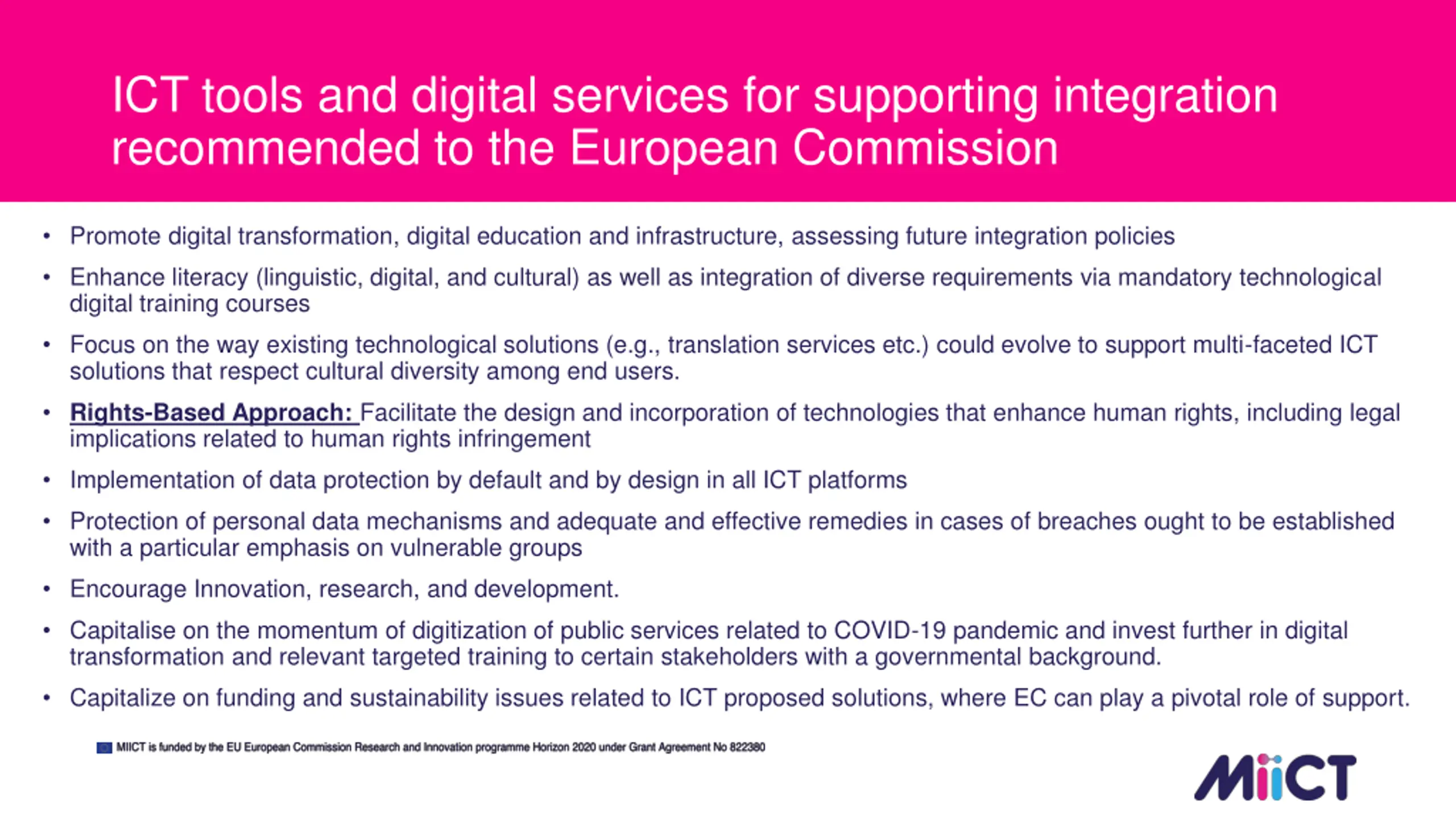 ICT tools and digital services for supporting integration recommended to the European Commission Promote digital transformation, digital education and infrastructure, assessing future integration policies Enhance literacy (linguistic, digital, and cultural) as well as integration of diverse requirements via mandatory technological digital training courses Focus on the way existing technological solutions (e.g., translation services etc.) could evolve to support multi-faceted ICT solutions that respect cultural diversity among end users. Rights-Based Approach: Facilitate the design and incorporation of technologies that enhance human rights, including legal implications related to human rights infringement Implementation of data protection by default and by design in all ICT platforms Protection of personal data mechanisms and adequate and effective remedies in cases of breaches ought to be established with a particular emphasis on vulnerable groups Encourage Innovation, research, and development. Capitalise on the momentum of digitization of public services related to COVID-19 pandemic and invest further in digital transformation and relevant targeted training to certain stakeholders with a governmental background. Capitalize on funding and sustainability issues related to ICT proposed solutions, where EC can play a pivotal role of support.