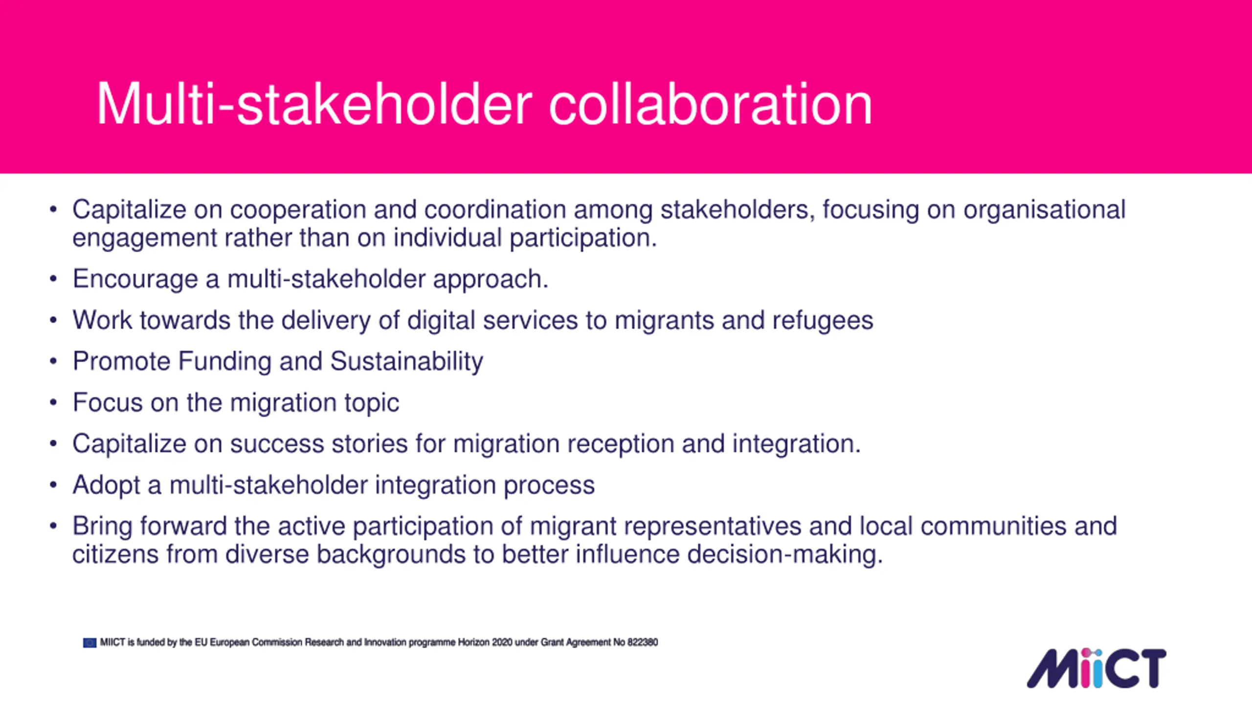 Multi-stakeholder collaboration Capitalize on cooperation and coordination among stakeholders, focusing on organisational engagement rather than on individual participation. Encourage a multi-stakeholder approach. Work towards the delivery of digital services to migrants and refugees Promote Funding and Sustainability Focus on the migration topic Capitalize on success stories for migration reception and integration. Adopt a multi-stakeholder integration process Bring forward the active participation of migrant representatives and local communities and citizens from diverse backgrounds to better influence decision-making.
