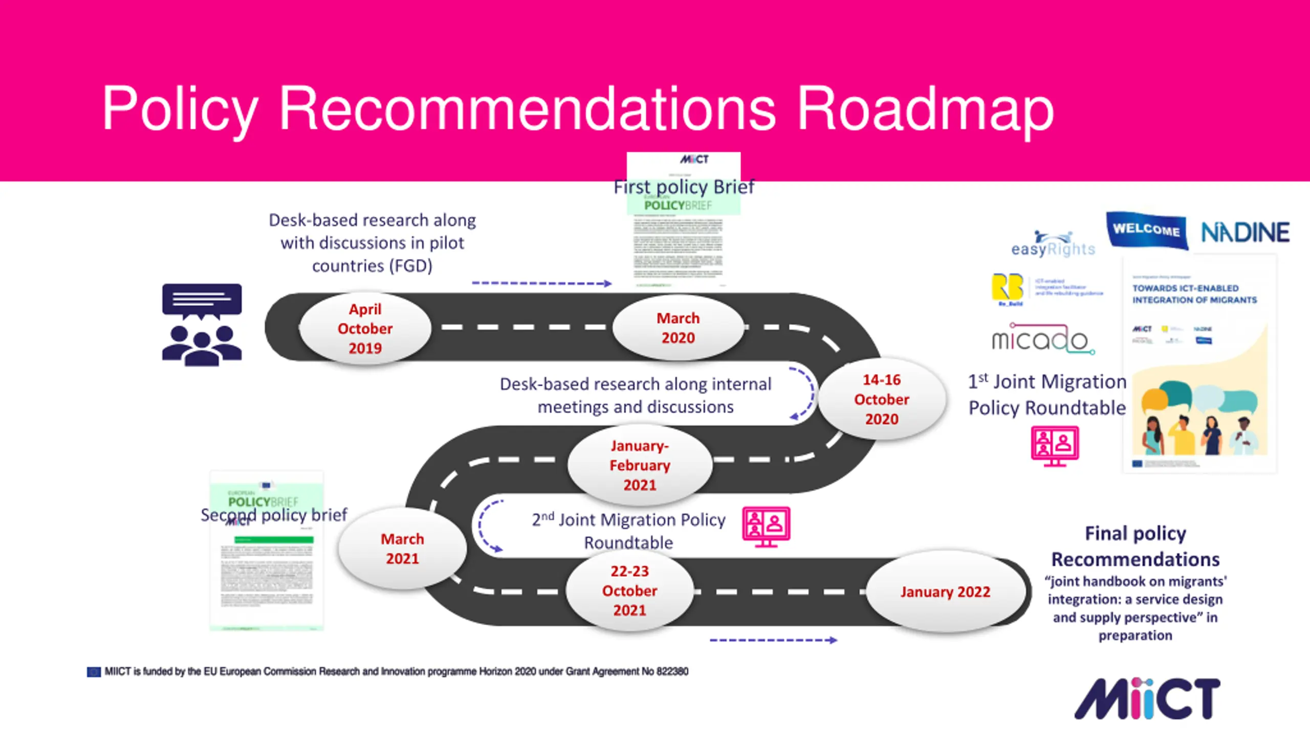 Policy Recommendations Roadmap First policy Brief Desk-based research along with discussions in pilot countries (FGD) April October 2019 March 2020 1st Joint Migration Policy Roundtable 14-16 October 2020 Desk-based research along internal meetings and discussions January- February 2021 Second policy brief 2nd Joint Migration Policy Roundtable Final policy Recommendations joint handbook on migrants' integration: a service design and supply perspective in preparation March 2021 22-23 October 2021 January 2022