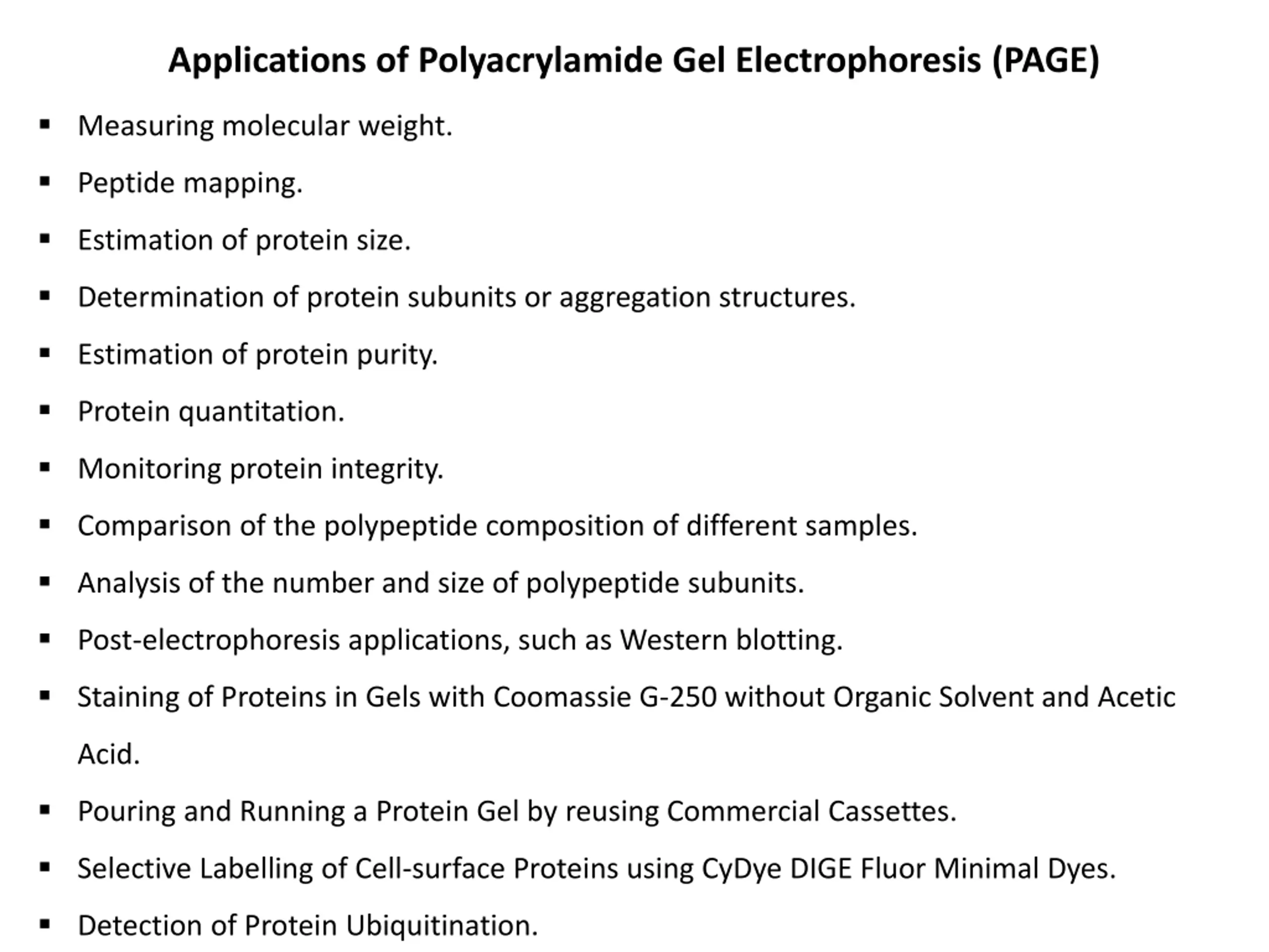 Applications of Polyacrylamide Gel Electrophoresis (PAGE) Measuring molecular weight. Peptide mapping. Estimation of protein size. Determination of protein subunits or aggregation structures. Estimation of protein purity. Protein quantitation. Monitoring protein integrity. Comparison of the polypeptide composition of different samples. Analysis of the number and size of polypeptide subunits. Post-electrophoresis applications, such as Western blotting. Staining of Proteins in Gels with Coomassie G-250 without Organic Solvent and Acetic Acid. Pouring and Running a Protein Gel by reusing Commercial Cassettes. Selective Labelling of Cell-surface Proteins using CyDye DIGE Fluor Minimal Dyes. Detection of Protein Ubiquitination.