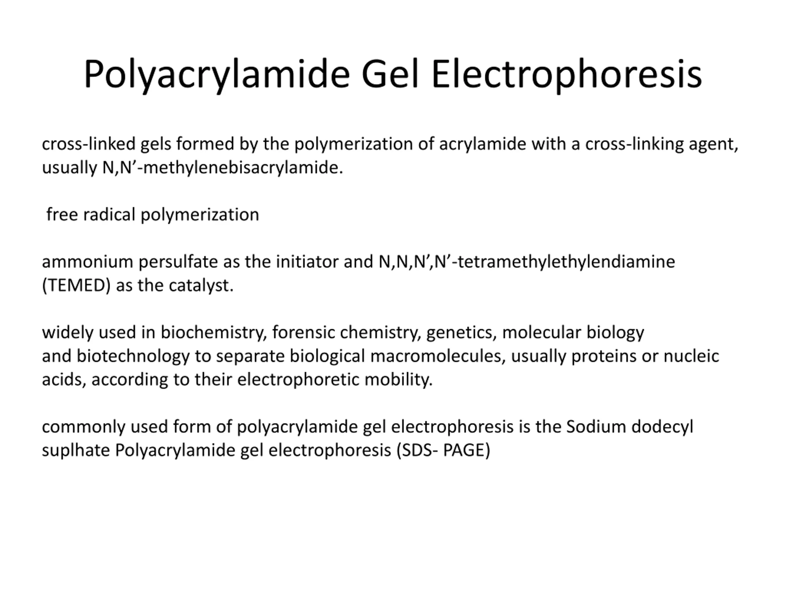 Polyacrylamide Gel Electrophoresis cross-linked gels formed by the polymerization of acrylamide with a cross-linking agent, usually N,N -methylenebisacrylamide. free radical polymerization ammonium persulfate as the initiator and N,N,N ,N -tetramethylethylendiamine (TEMED) as the catalyst. widely used in biochemistry, forensic chemistry, genetics, molecular biology and biotechnology to separate biological macromolecules, usually proteins or nucleic acids, according to their electrophoretic mobility. commonly used form of polyacrylamide gel electrophoresis is the Sodium dodecyl suplhate Polyacrylamide gel electrophoresis (SDS- PAGE)