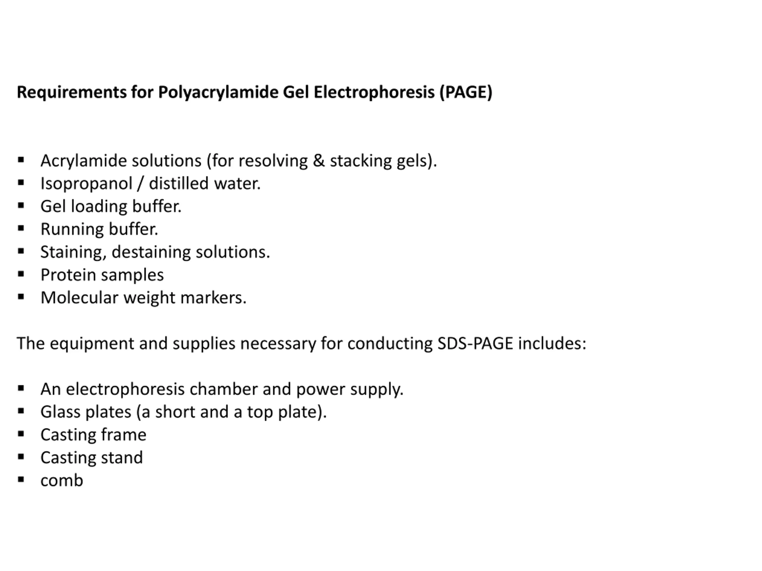 Requirements for Polyacrylamide Gel Electrophoresis (PAGE) Acrylamide solutions (for resolving & stacking gels). Isopropanol / distilled water. Gel loading buffer. Running buffer. Staining, destaining solutions. Protein samples Molecular weight markers. The equipment and supplies necessary for conducting SDS-PAGE includes: An electrophoresis chamber and power supply. Glass plates (a short and a top plate). Casting frame Casting stand comb