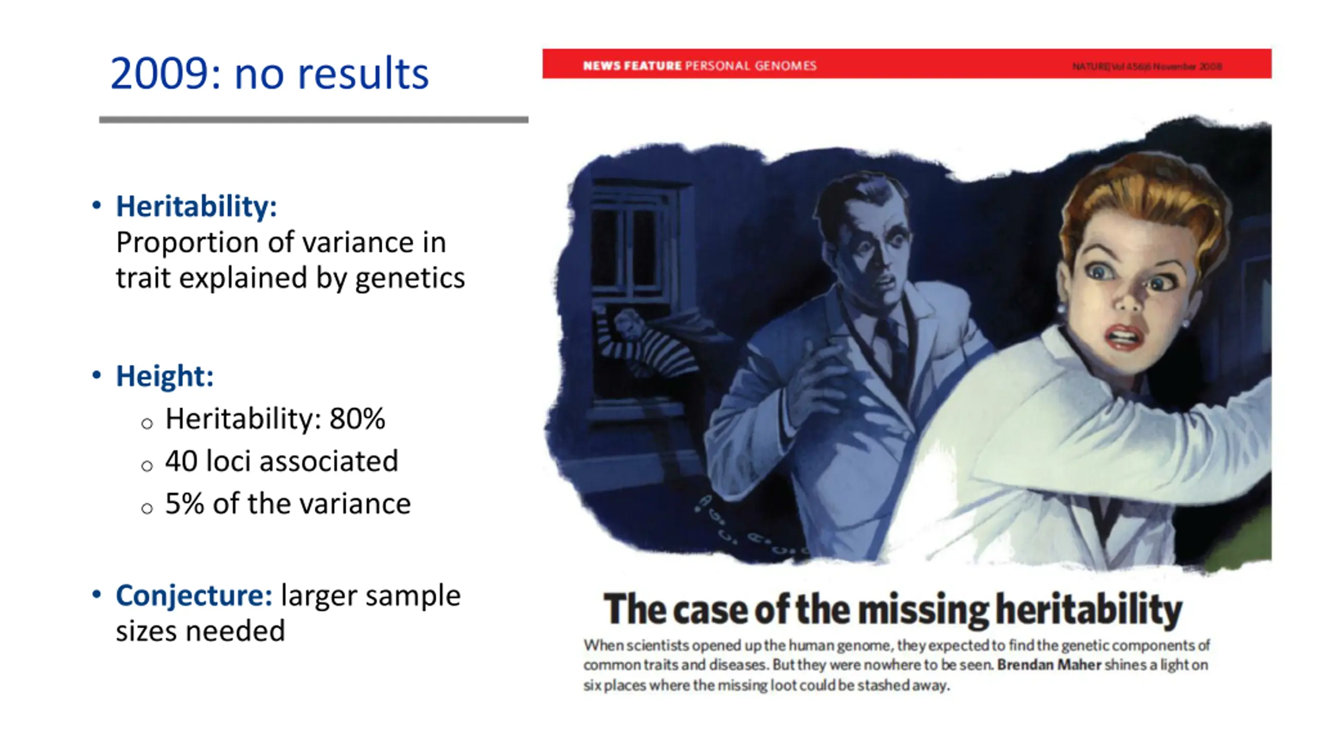 2009: no results Heritability: Proportion of variance in trait explained by genetics Height: o Heritability: 80% o 40 loci associated o 5% of the variance Conjecture: larger sample sizes needed
