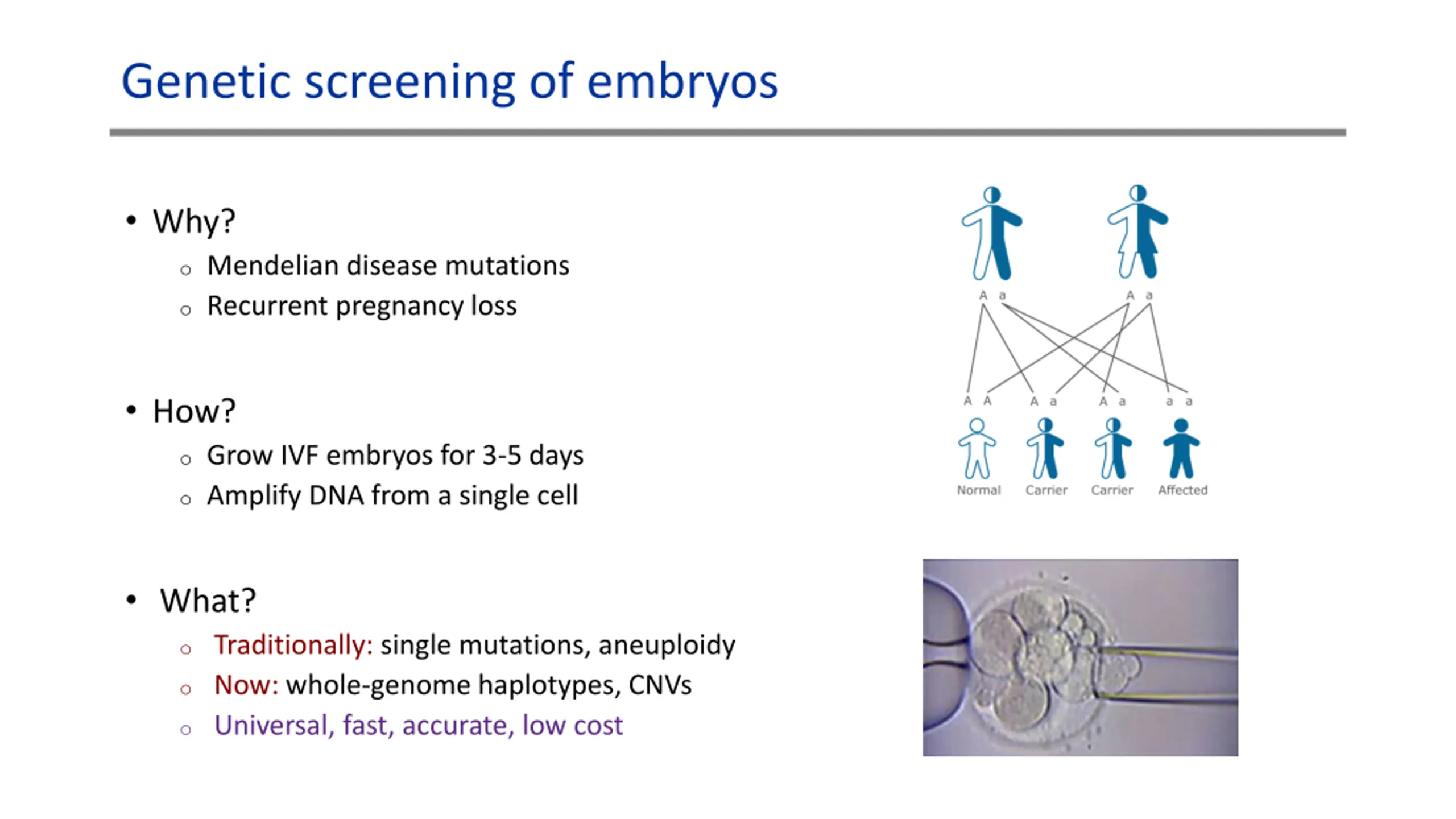Genetic screening of embryos Why? o Mendelian disease mutations o Recurrent pregnancy loss How? o Grow IVF embryos for 3-5 days o Amplify DNA from a single cell What? o Traditionally: single mutations, aneuploidy o Now: whole-genome haplotypes, CNVs o Universal, fast, accurate, low cost
