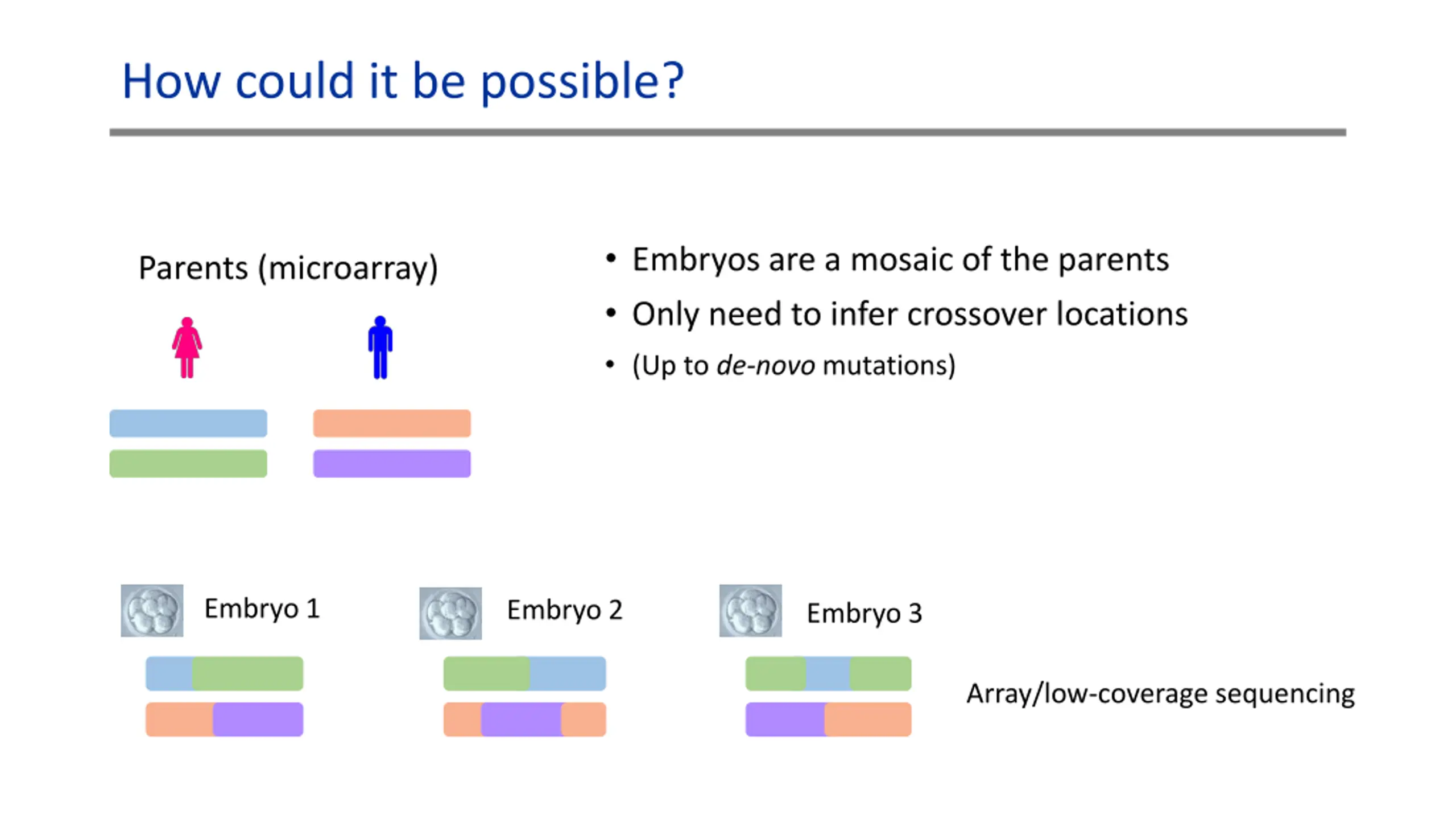 How could it be possible? Embryos are a mosaic of the parents Only need to infer crossover locations (Up to de-novo mutations) Parents (microarray) Embryo 1 Embryo 2 Embryo 3 Array/low-coverage sequencing