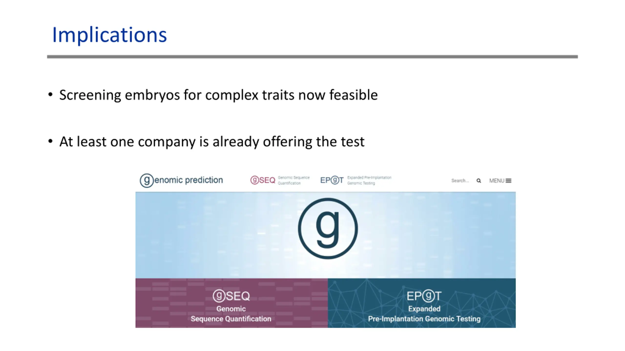 Implications Screening embryos for complex traits now feasible At least one company is already offering the test