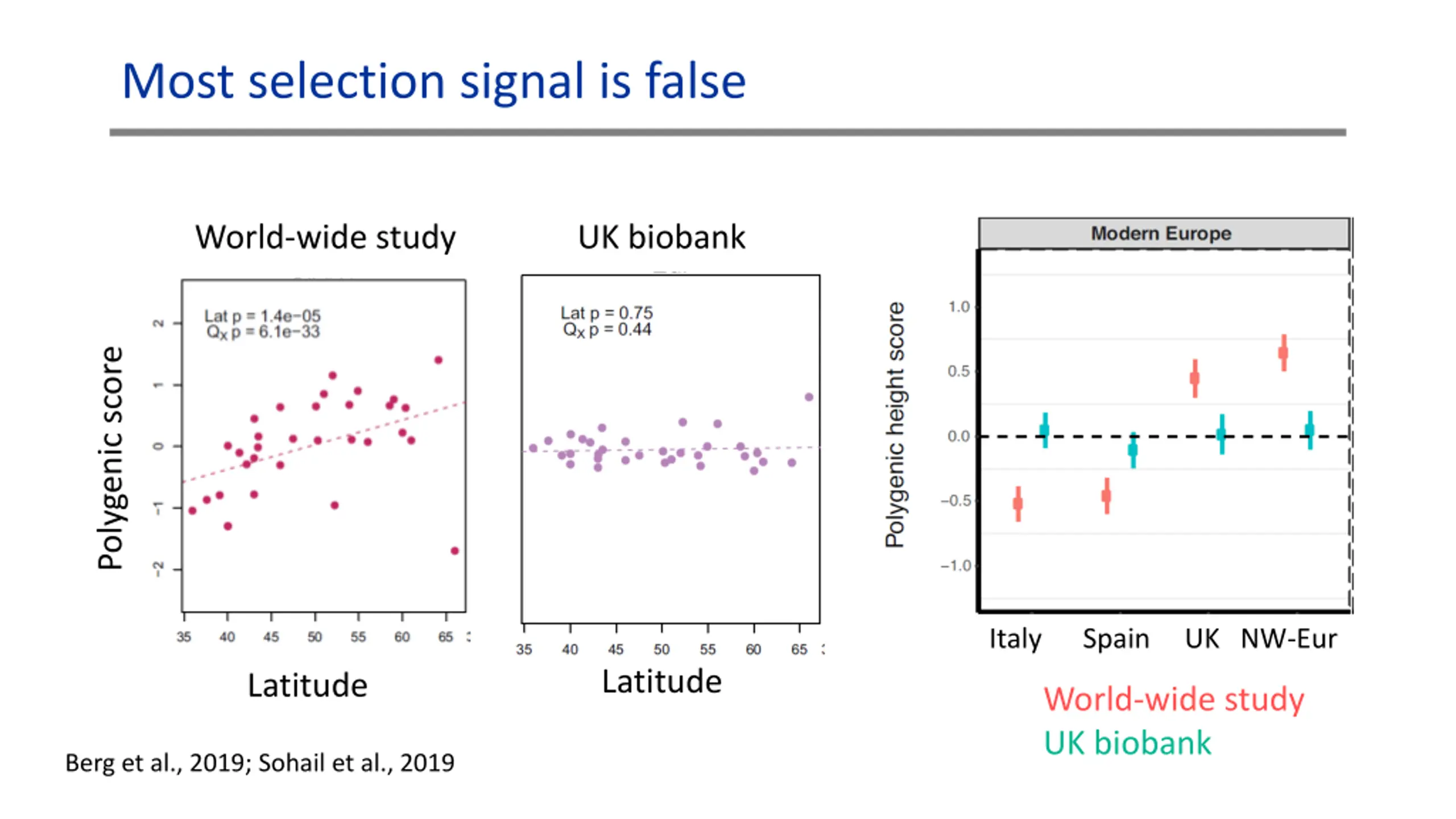 Most selection signal is false World-wide study UK biobank Polygenic score Italy Spain UK NW-Eur Latitude Latitude World-wide study UK biobank Berg et al., 2019; Sohail et al., 2019