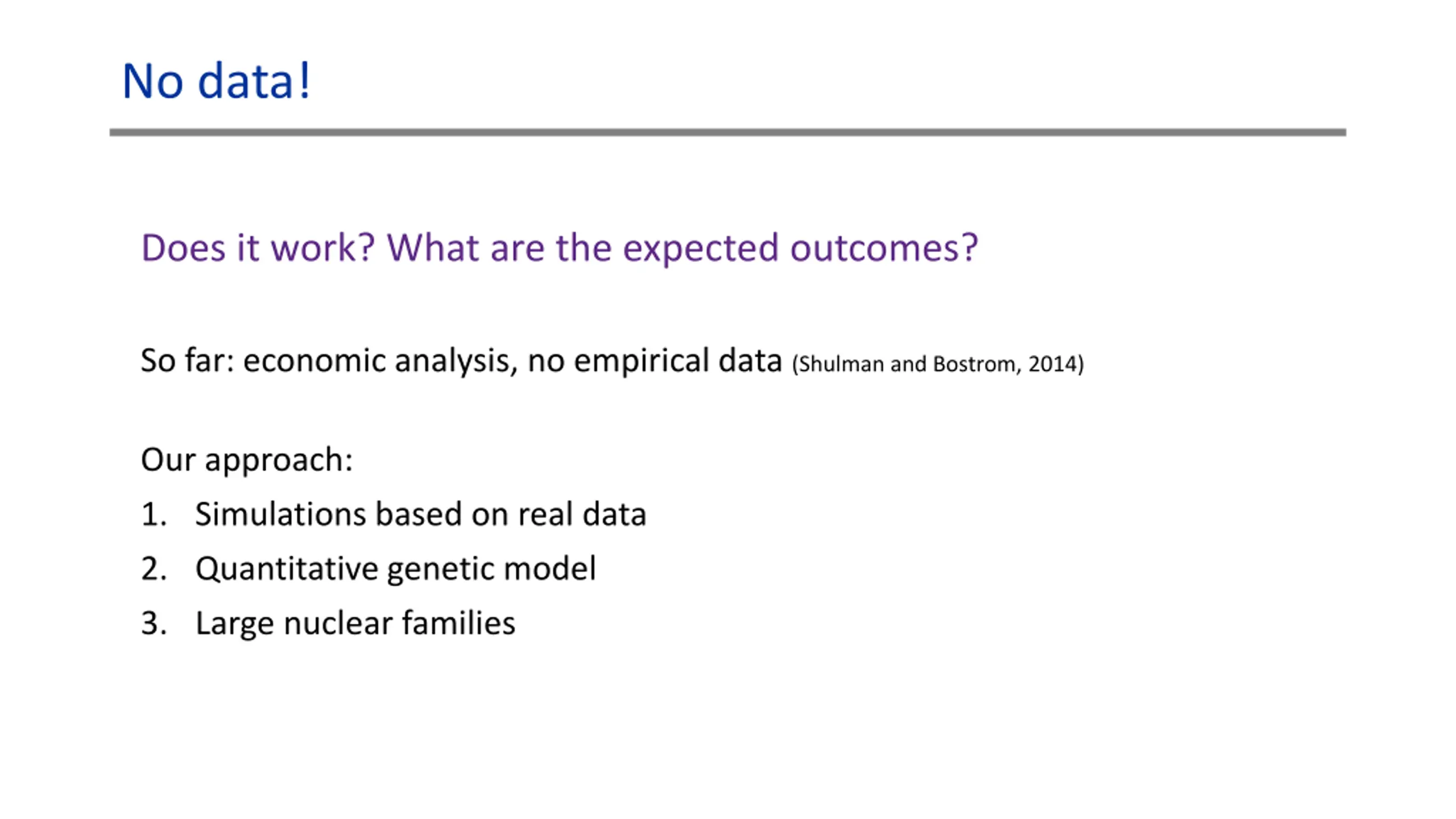 No data! Does it work? What are the expected outcomes? So far: economic analysis, no empirical data (Shulman and Bostrom, 2014) Our approach: 1. Simulations based on real data 2. Quantitative genetic model 3. Large nuclear families