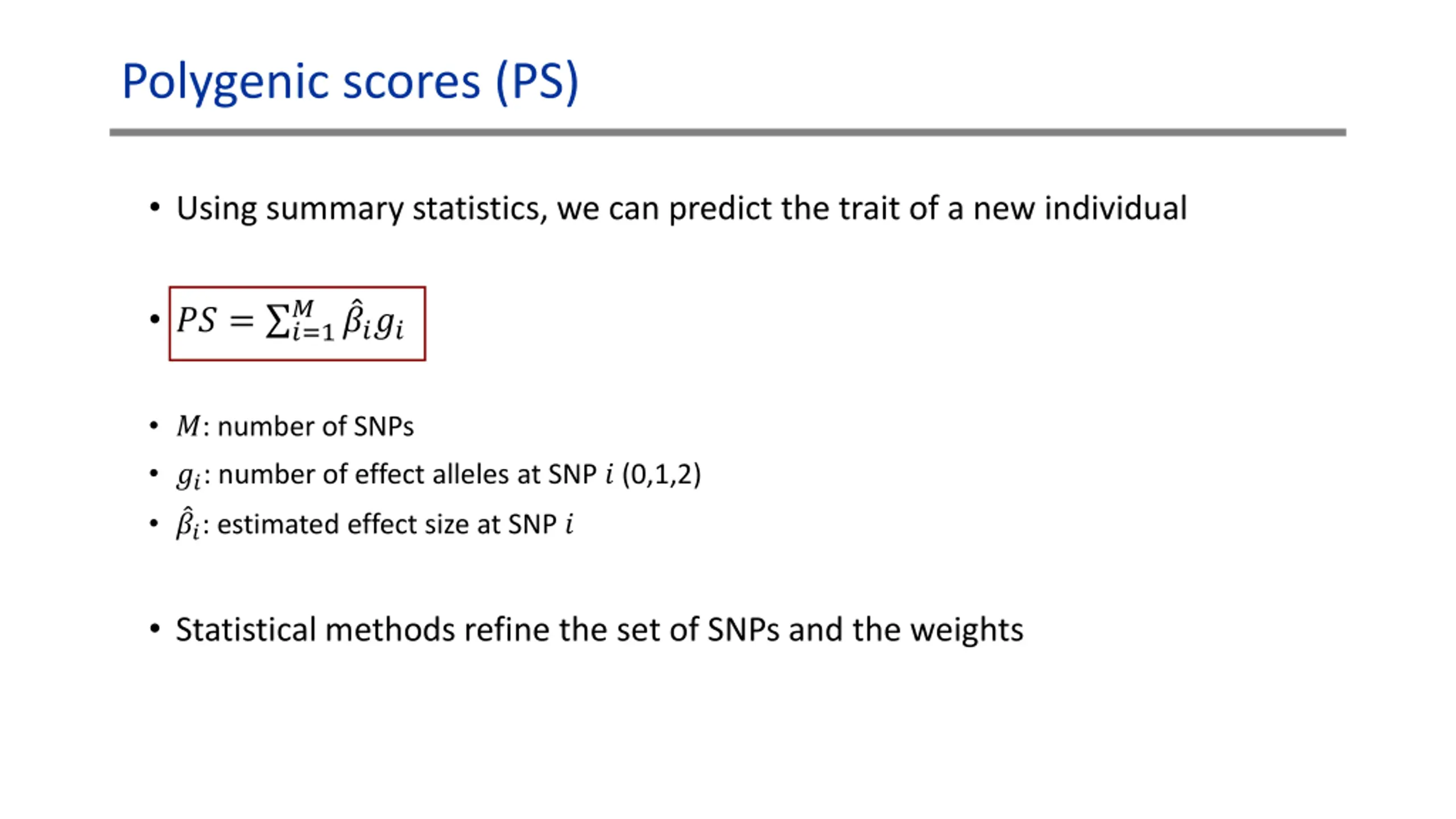 Polygenic scores (PS) Using summary statistics, we can predict the trait of a new individual ???? ? ?? = ?=1 ?: number of SNPs ??: number of effect alleles at SNP ? (0,1,2) ??: estimated effect size at SNP ? Statistical methods refine the set of SNPs and the weights
