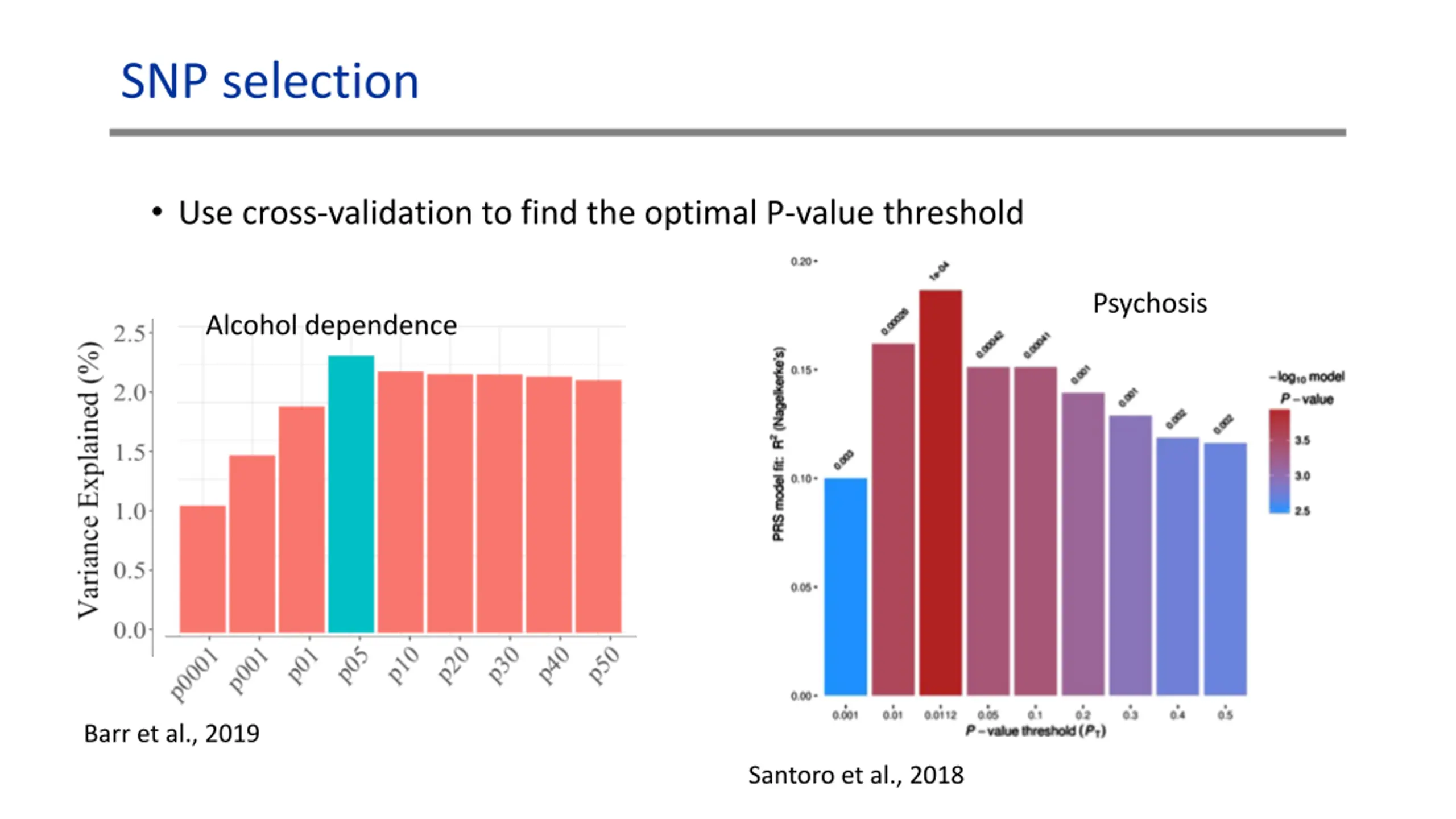 SNP selection Use cross-validation to find the optimal P-value threshold Psychosis Alcohol dependence Barr et al., 2019 Santoro et al., 2018