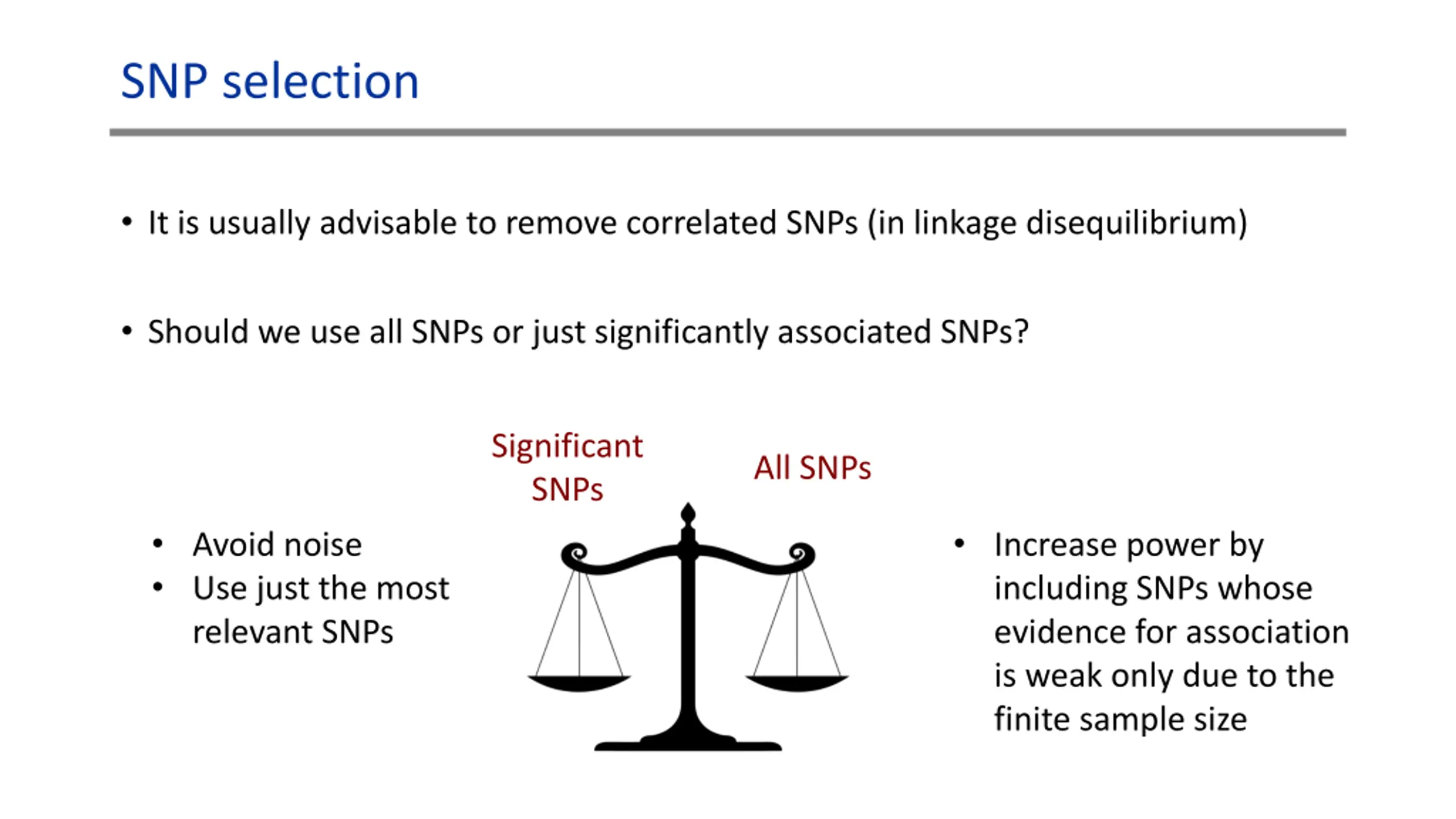 SNP selection It is usually advisable to remove correlated SNPs (in linkage disequilibrium) Should we use all SNPs or just significantly associated SNPs? Significant SNPs All SNPs Avoid noise Use just the most relevant SNPs Increase power by including SNPs whose evidence for association is weak only due to the finite sample size