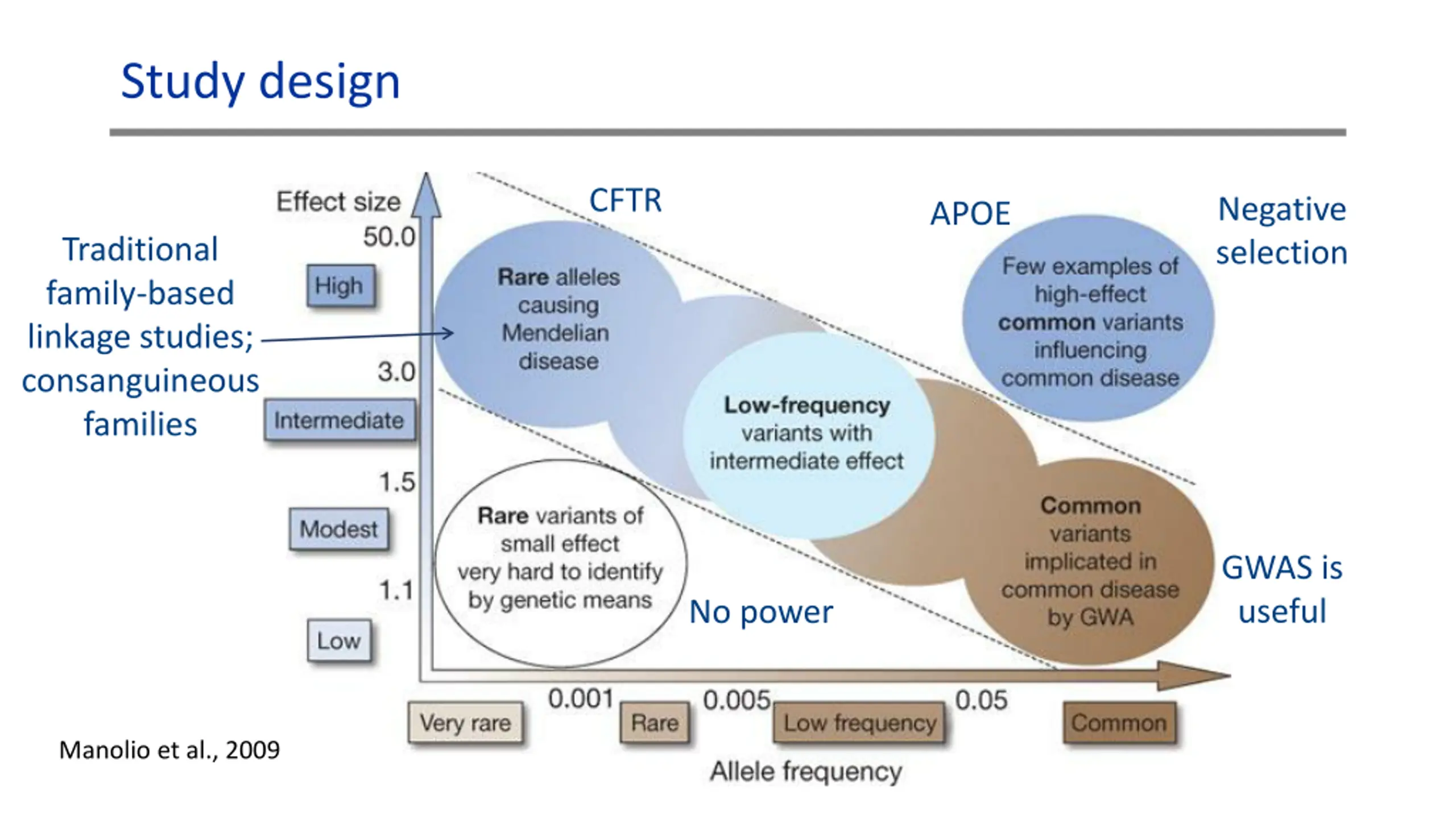 Study design CFTR Negative selection APOE Traditional family-based linkage studies; consanguineous families GWAS is useful No power Manolio et al., 2009