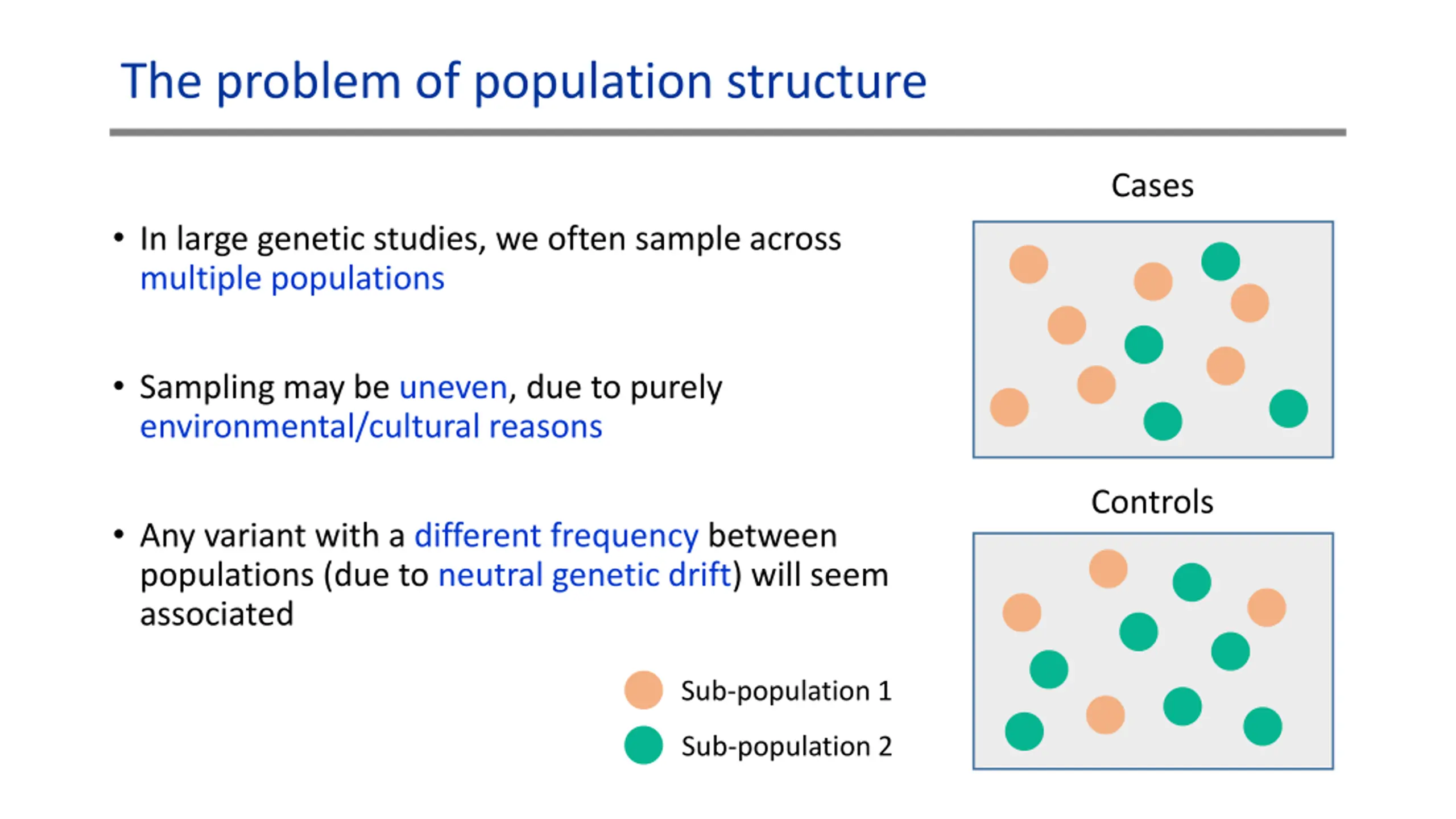 The problem of population structure Cases In large genetic studies, we often sample across multiple populations Sampling may be uneven, due to purely environmental/cultural reasons Controls Any variant with a different frequency between populations (due to neutral genetic drift) will seem associated Sub-population 1 Sub-population 2
