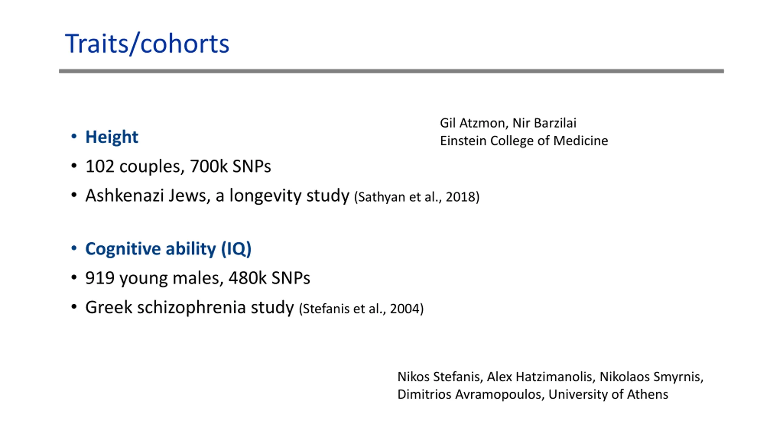 Traits/cohorts Gil Atzmon, Nir Barzilai Einstein College of Medicine Height 102 couples, 700k SNPs Ashkenazi Jews, a longevity study (Sathyan et al., 2018) Cognitive ability (IQ) 919 young males, 480k SNPs Greek schizophrenia study (Stefanis et al., 2004) Nikos Stefanis, Alex Hatzimanolis, Nikolaos Smyrnis, Dimitrios Avramopoulos, University of Athens