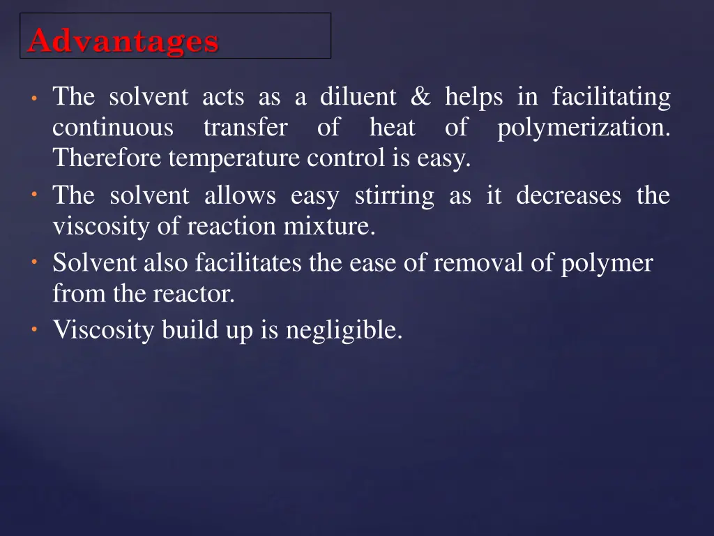 Advantages The solvent acts as a diluent & helps in facilitating continuous transfer of Therefore temperature control is easy. The solvent allows easy stirring as it decreases the viscosity of reaction mixture. Solvent also facilitates the ease of removal of polymer from the reactor. Viscosity build up is negligible. heat of polymerization.